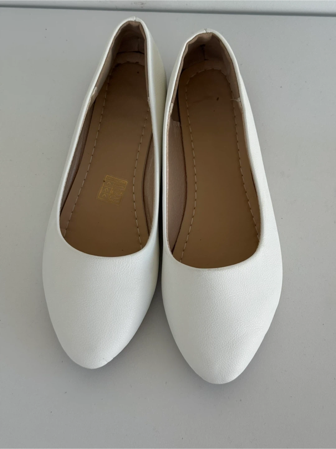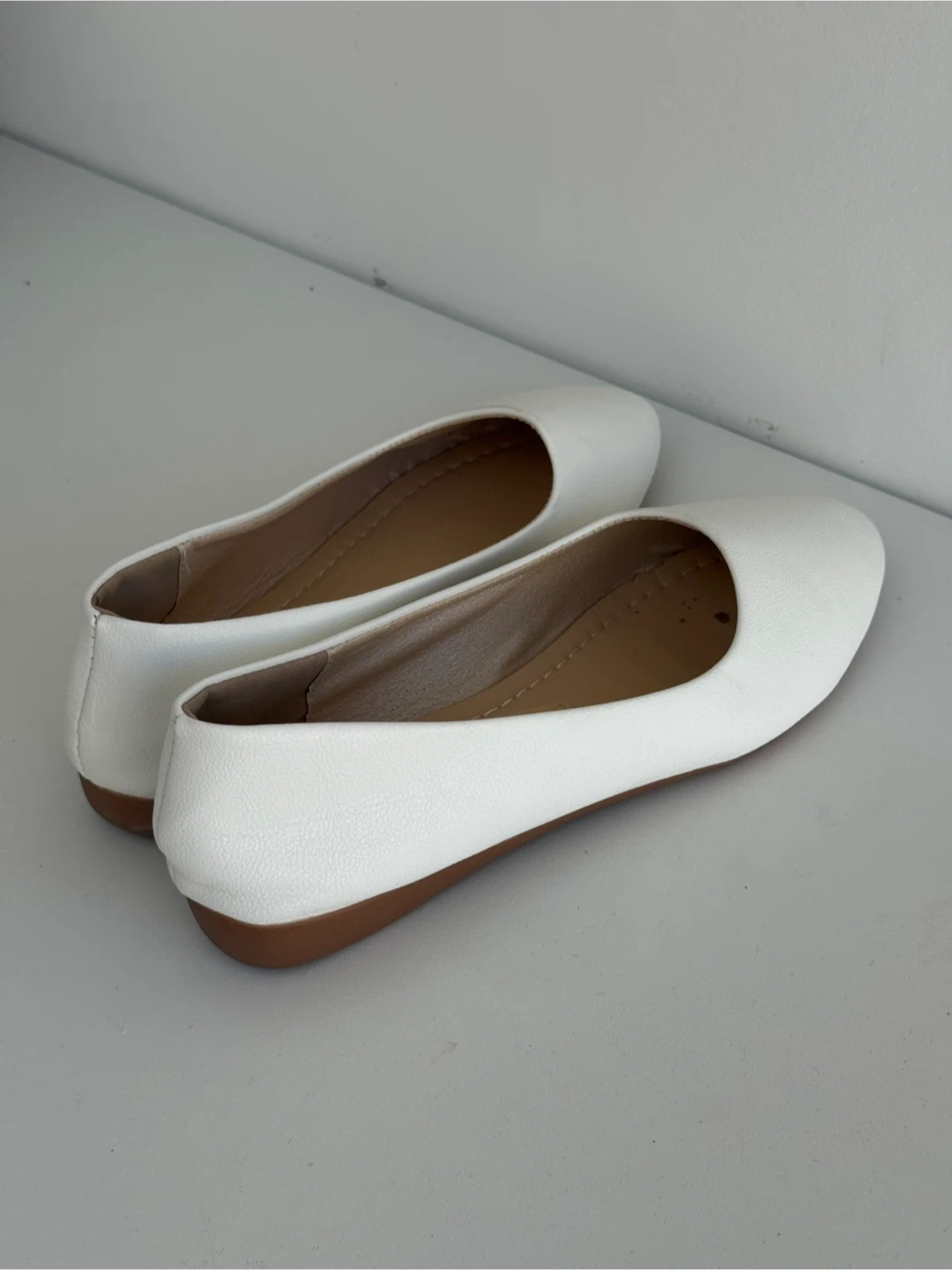 Here are some simple white ballet flats. They're perfect for everyday wear and are in great condition. They would look great with a dress or jeans!