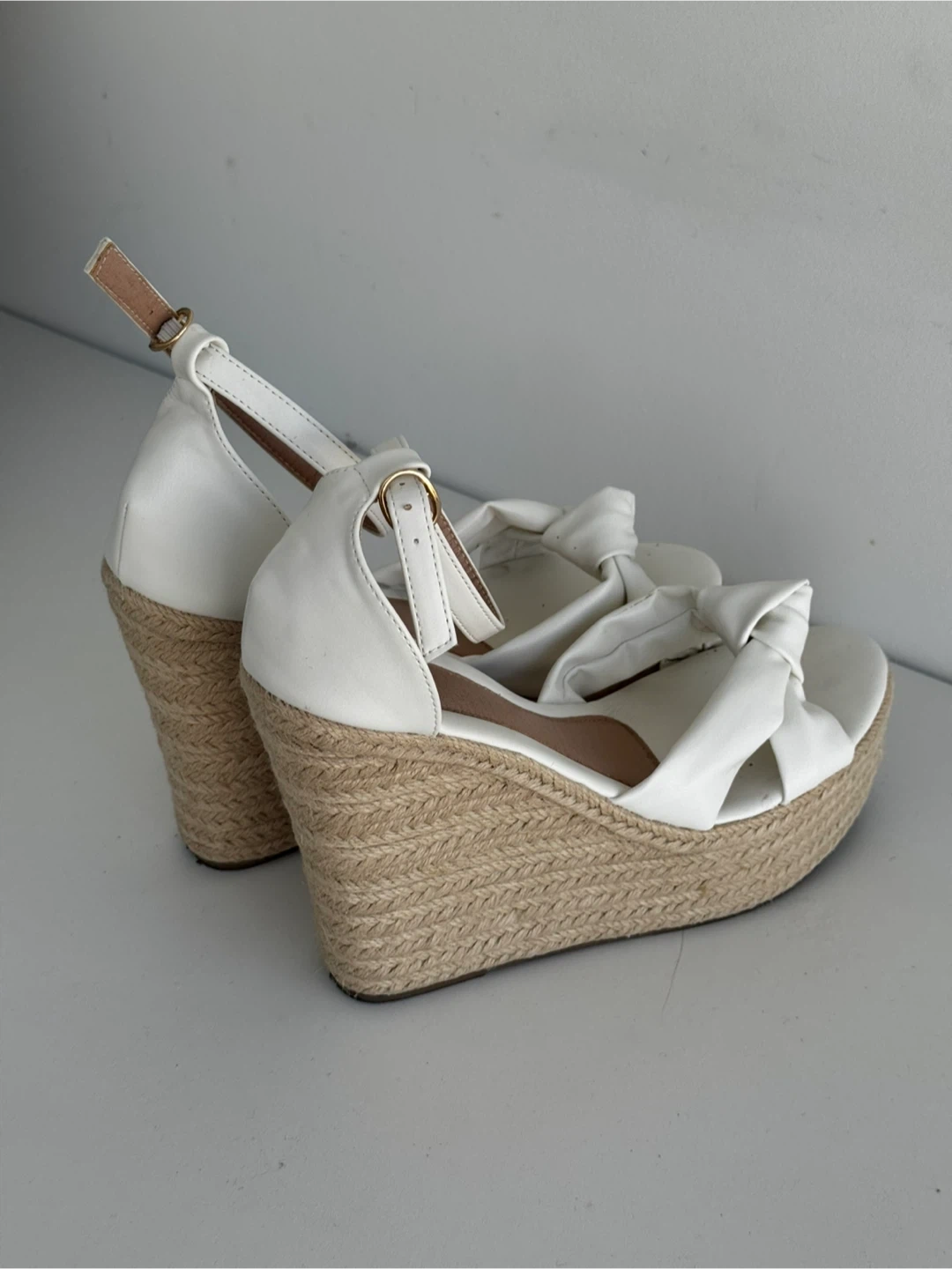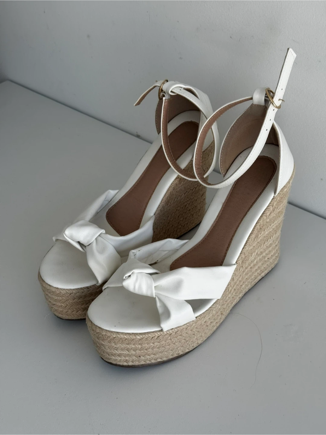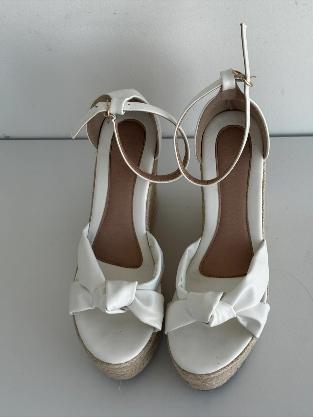 These are a pair of white wedge heel sandals, perfect for adding a bit of height and style! They feature a cute bow detail on the front and an ankle strap for a secure fit. They look to be in great condition and are a size 8.5/9