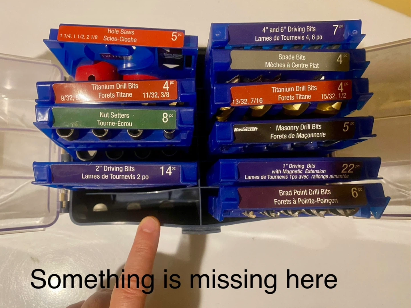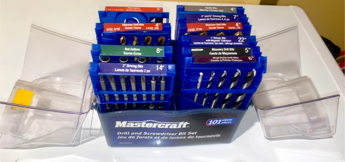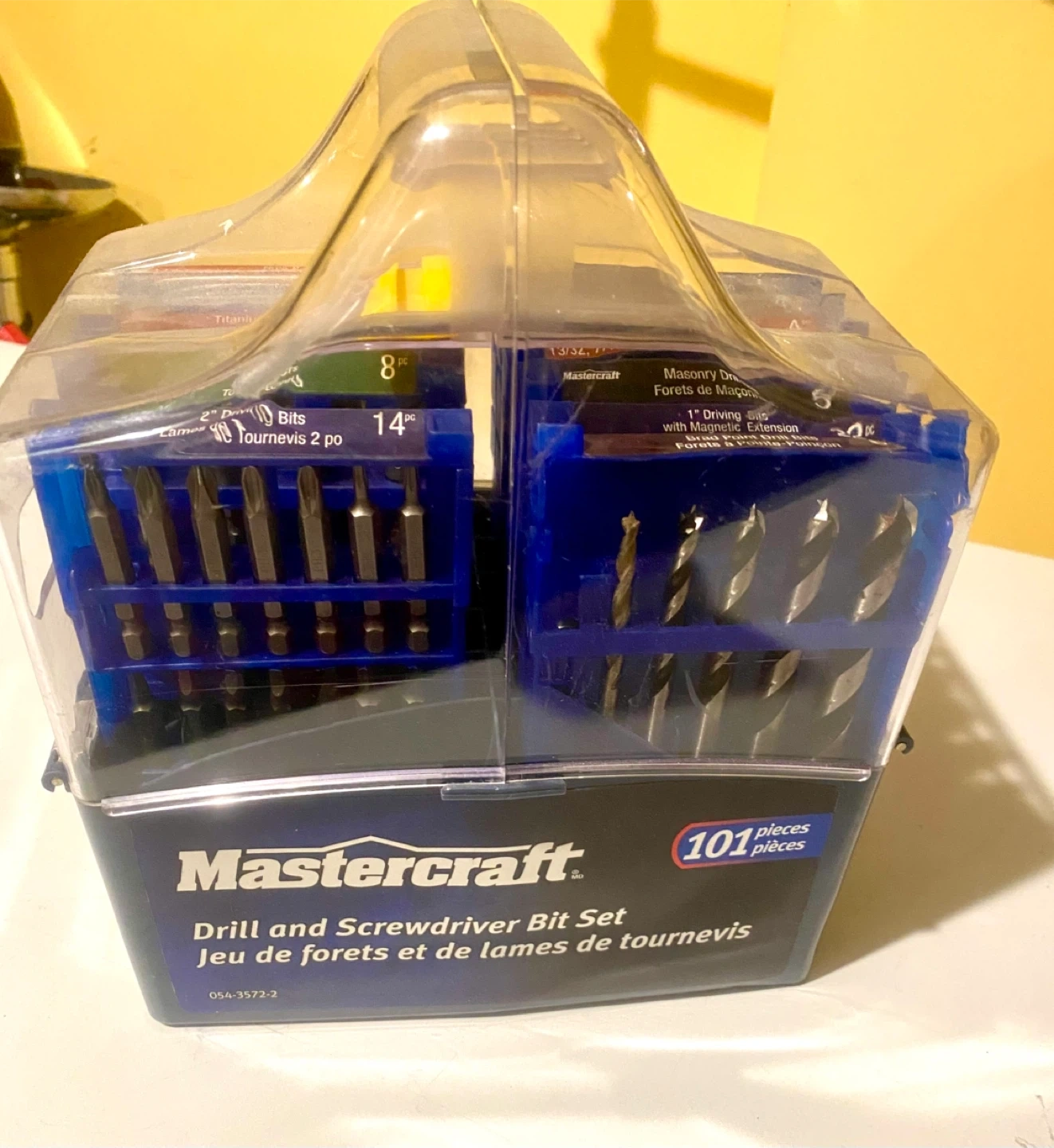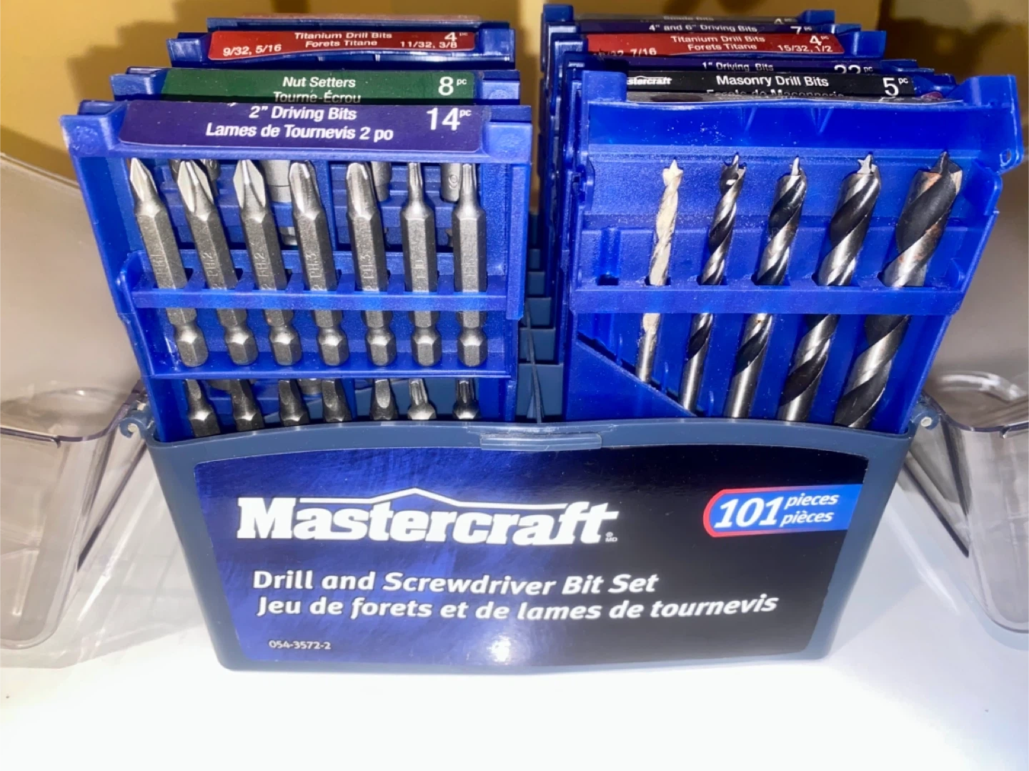 Selling a Mastercraft drill and screwdriver bit set! It comes with 101 pieces for all your drilling and screwdriving needs. Perfect for any DIY project or professional job Something is missing here I don’t know what is missing