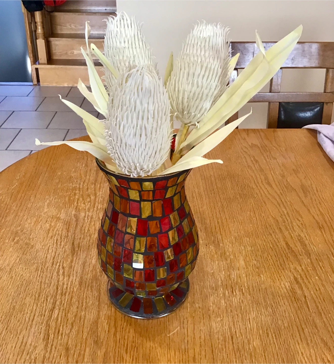 A lovely mosaic vase with a colourful design, perfect for adding a touch of brightness to any room. It comes with some beautiful white flowers to complete the look!