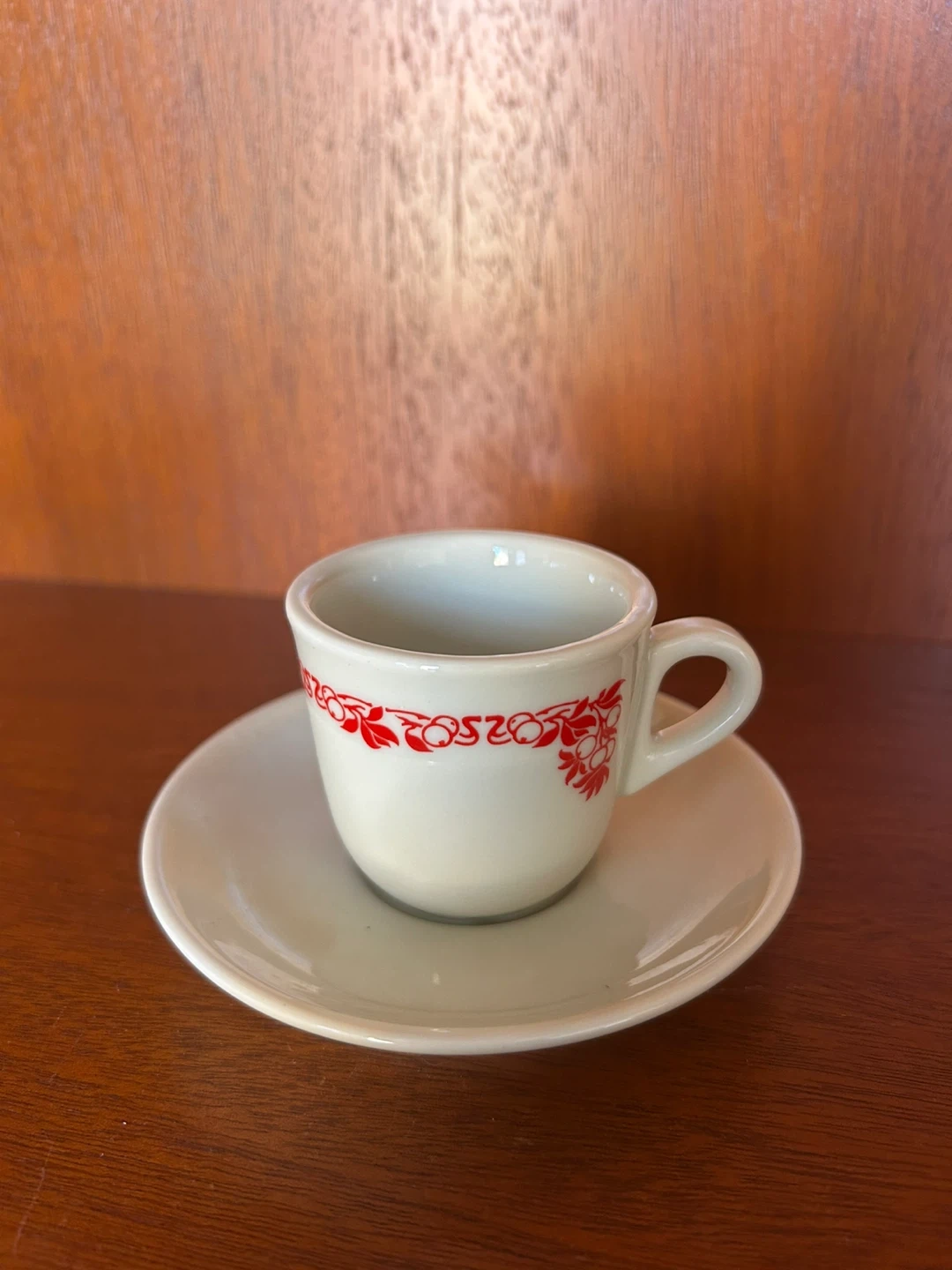Selling a set of demitasse cups and saucers made by IPA Italy. They have a delicate red floral design. Perfect for espresso or small servings of coffee!