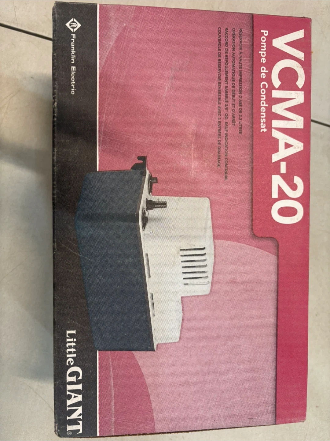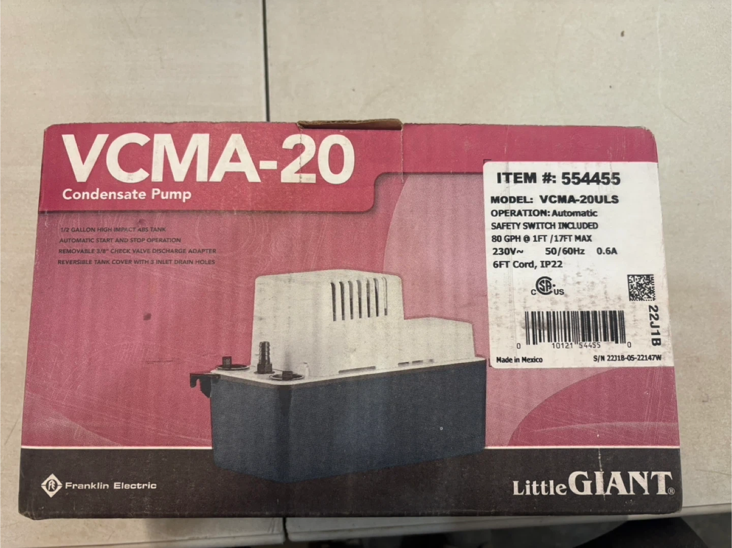 9Selling a Little Giant VCMA-20 Condensate Pump. It's in its original box and looks to be in great condition. It's a 1/2 gallon high-impact ABS tank with automatic start and stop operation. The model number is VCMA-20ULS. It also features a removable 1/4" check valve discharge adapter and a reversible tank cover with 3 inlet drain holes