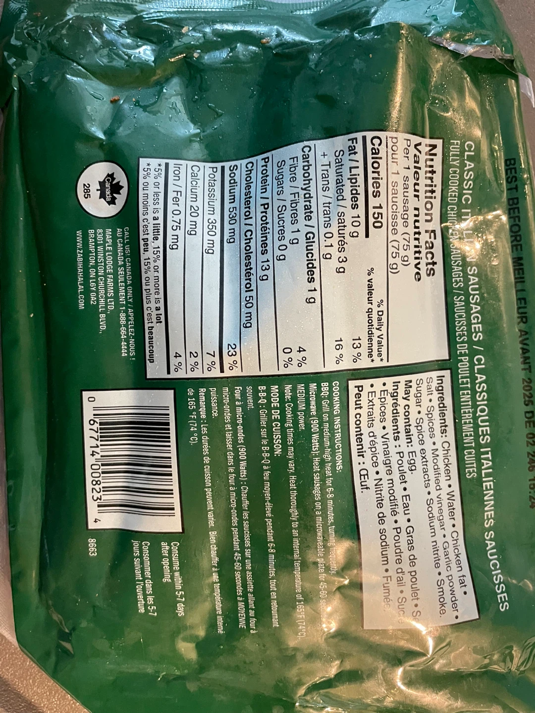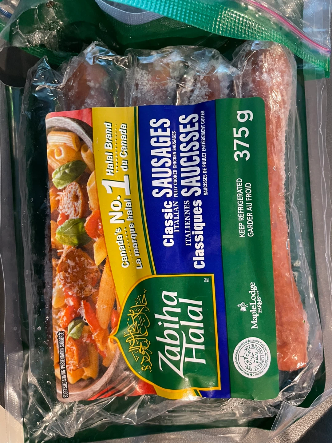 package of Zabiha Halal Classic Italian Sausages. These are fully cooked chicken sausages, weighing 375g. Best before 2026 February 02. Keep refrigerated