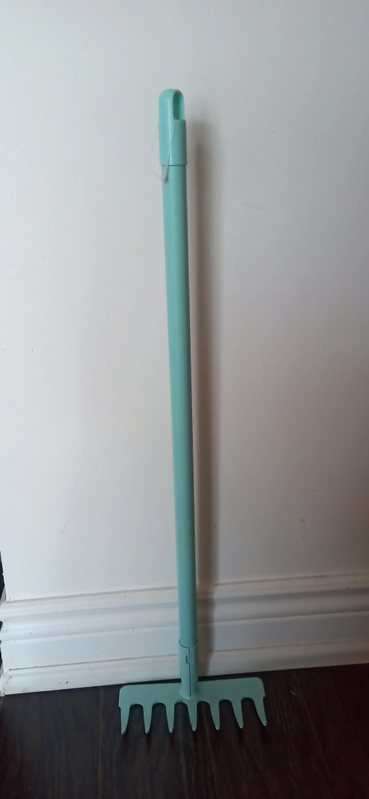 Selling a light blue garden rake perfect for kids! It's about 28inches tall, making it easy for little ones to use in the garden. It's in good condition and ready for some fun outdoor play
