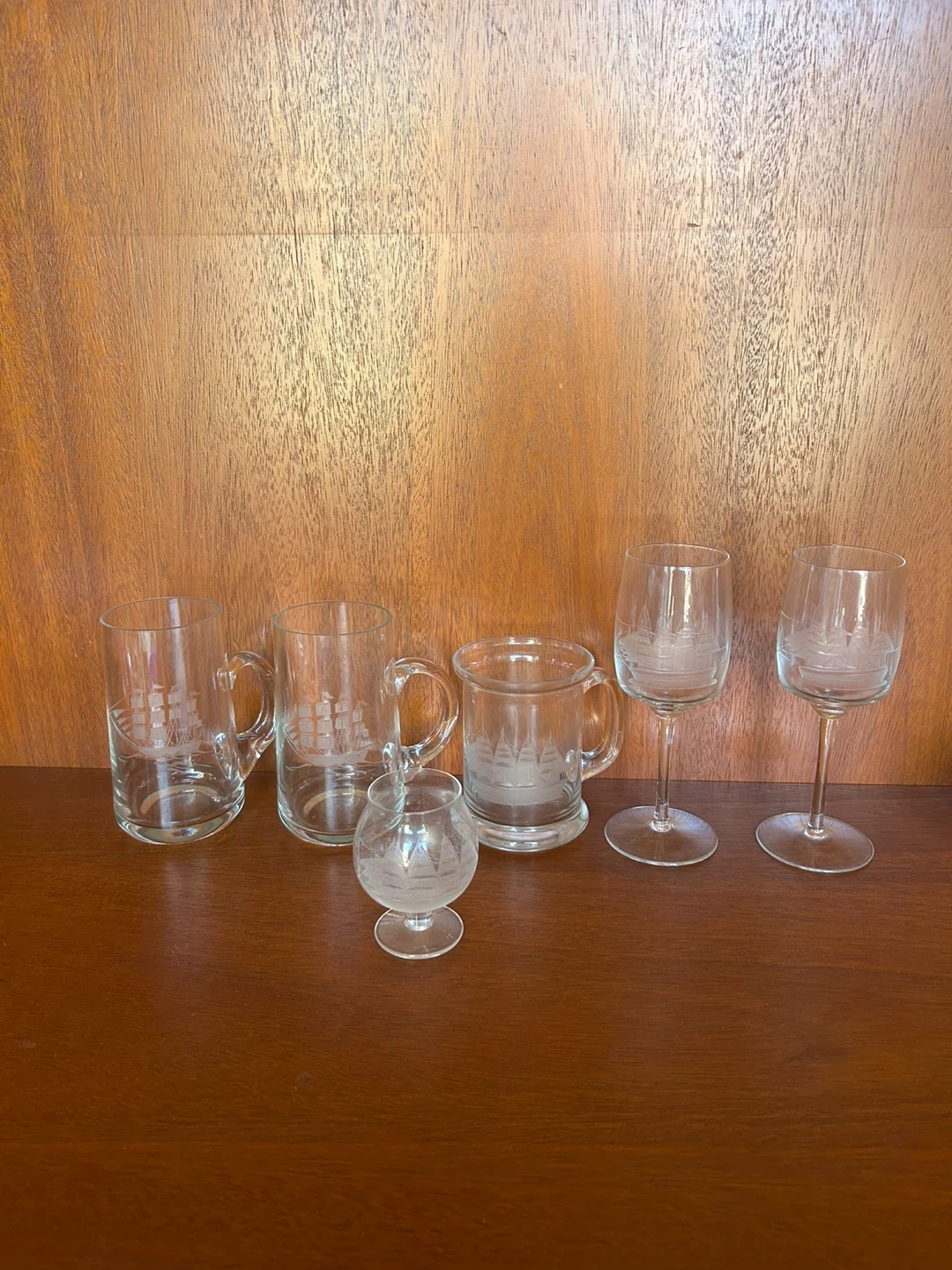 Selling a set of clear glass drinkware with a nautical ship etched design. Includes mugs, wine glasses, and a small glass. Great for adding a touch of maritime charm to your home bar or kitchen