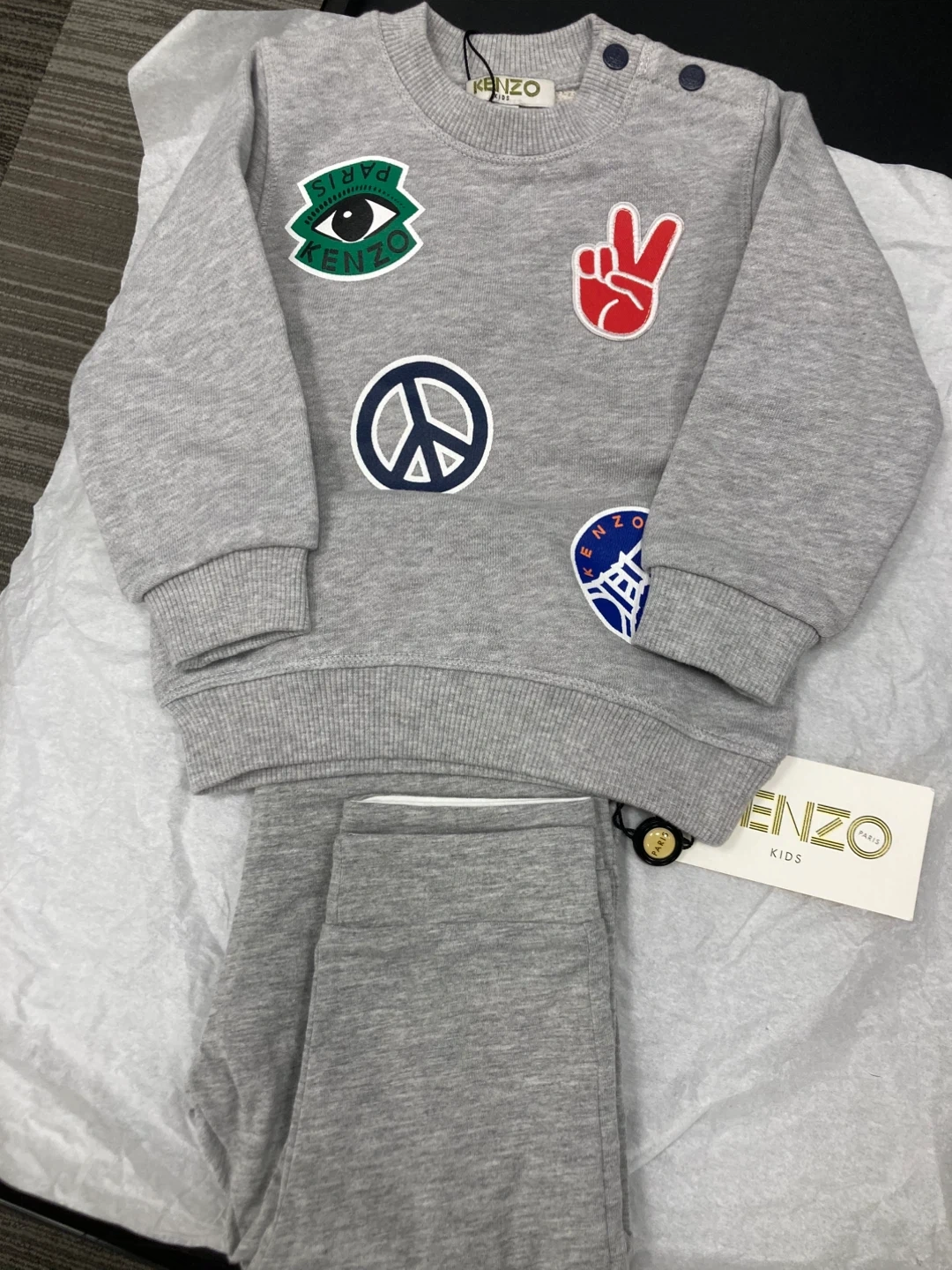 KENZO Kids set, including a sweatshirt and pants in a stylish grey color. The sweatshirt features fun, colorful patches. Perfect for your little one! I bought this with tax $329 Pick up and by cash 🥕