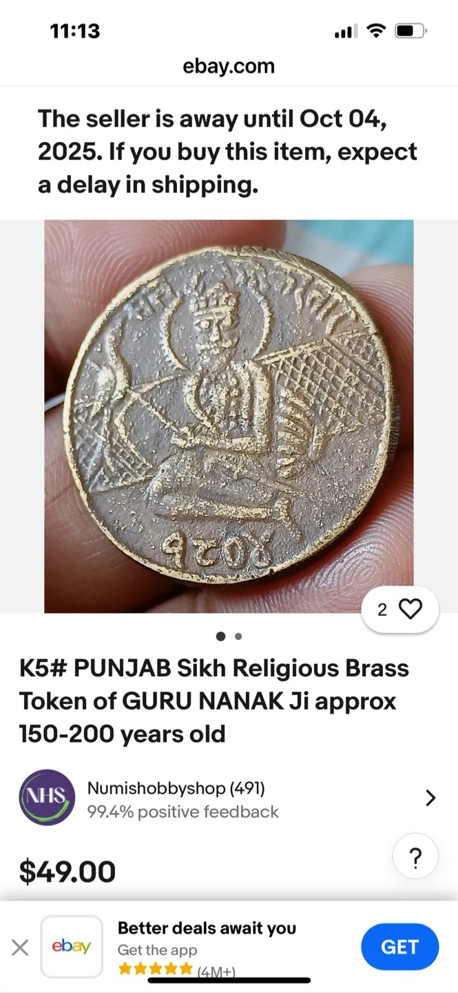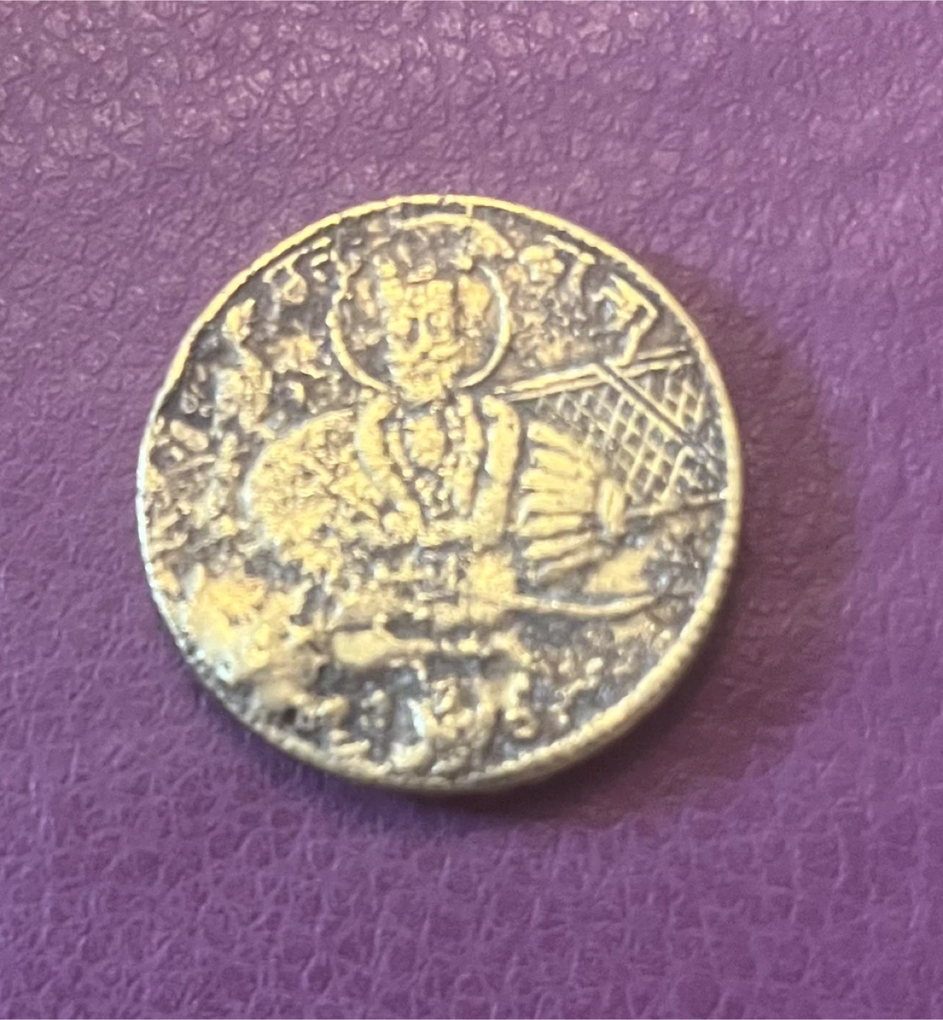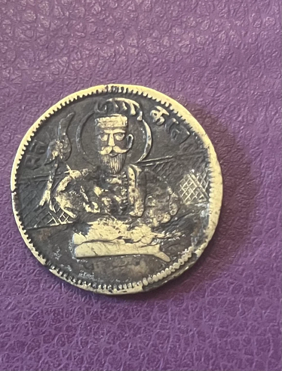 45 dollars each two available Riligious token best offer accepted English: Reverse: Guru Gobind Singh holding a bird. The inscription above in Nagari script is “Sat Kartar” (The True Creator). The year date below is Vikram Samvat 1804 = 1747 AD)