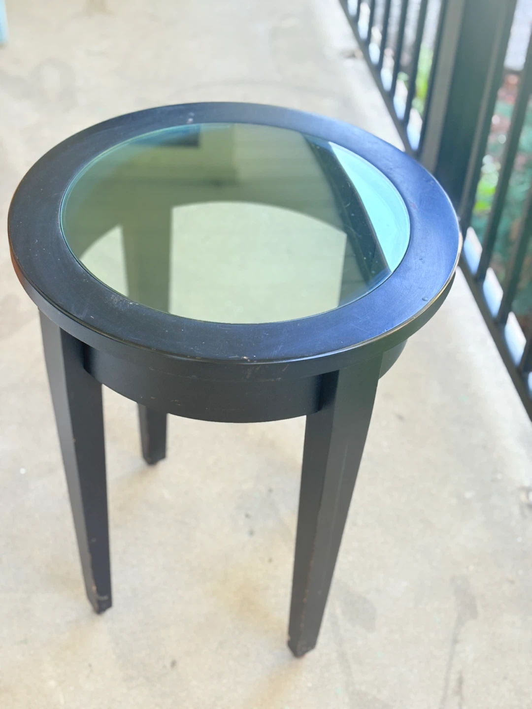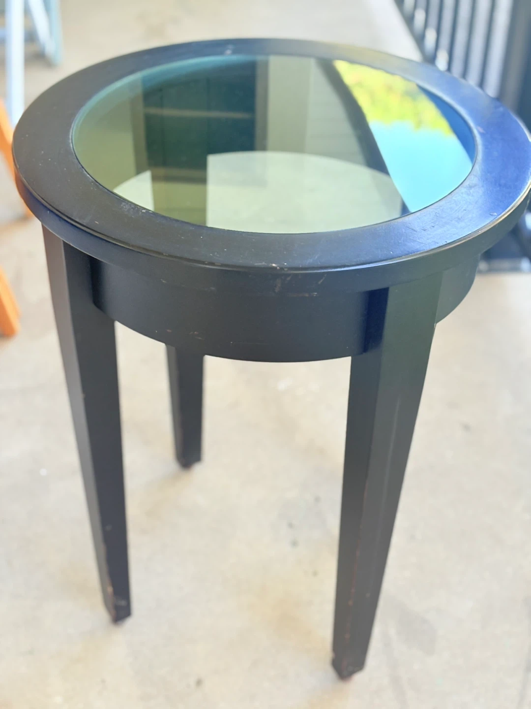 Selling a cute little black side table with a round glass top. It's perfect for small spaces or as an accent piece in your living room. It has some signs of wear, but it's still sturdy and stylish!