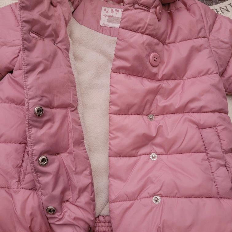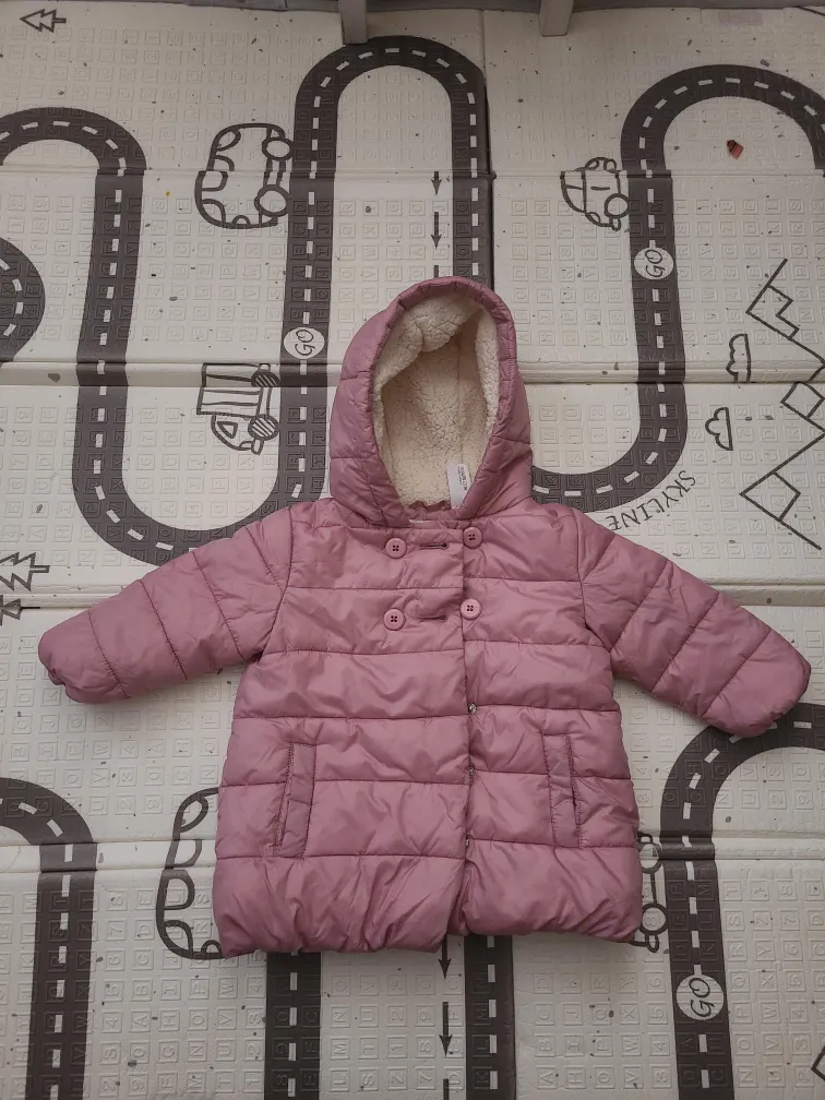 A cute and cozy puffer jacket from Baby Club! It's a lovely shade of pink and features a warm, sherpa-lined hood. The jacket has button closures and is in great condition. Perfect for keeping your little one snug during cooler weather