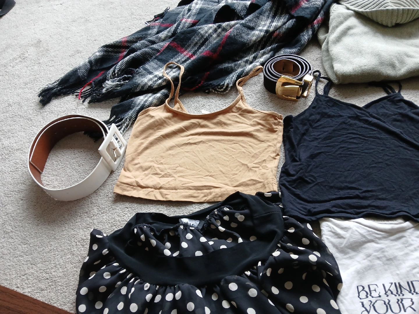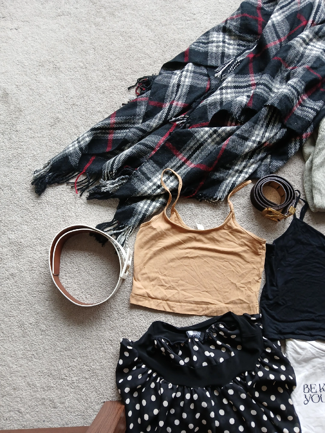 - Porda black and white polka dot blouse (a bit sheer)