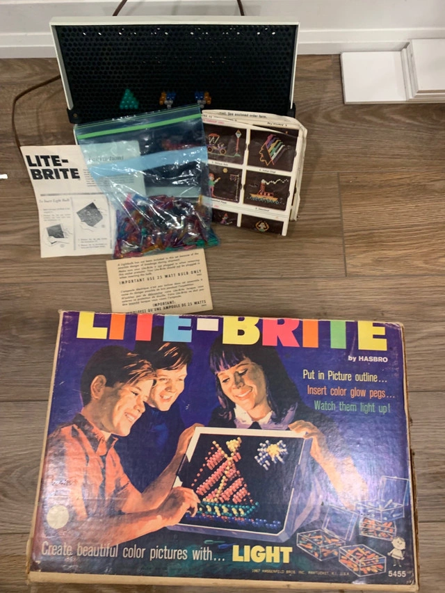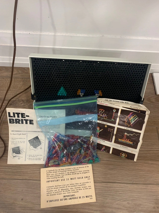 Experience a blast from the past with this vintage Hasbro Lite-Brite, a classic 1960s toy that still sparks creativity. While it shows signs of use, this nostalgic piece is in good working condition, ready to illuminate your imagination. -The set includes the original box, light box, some design sheets, and a generous supply of colourful pegs to get you started on your glowing masterpiece. BULB INCLUDED! WEST END PICK UP
