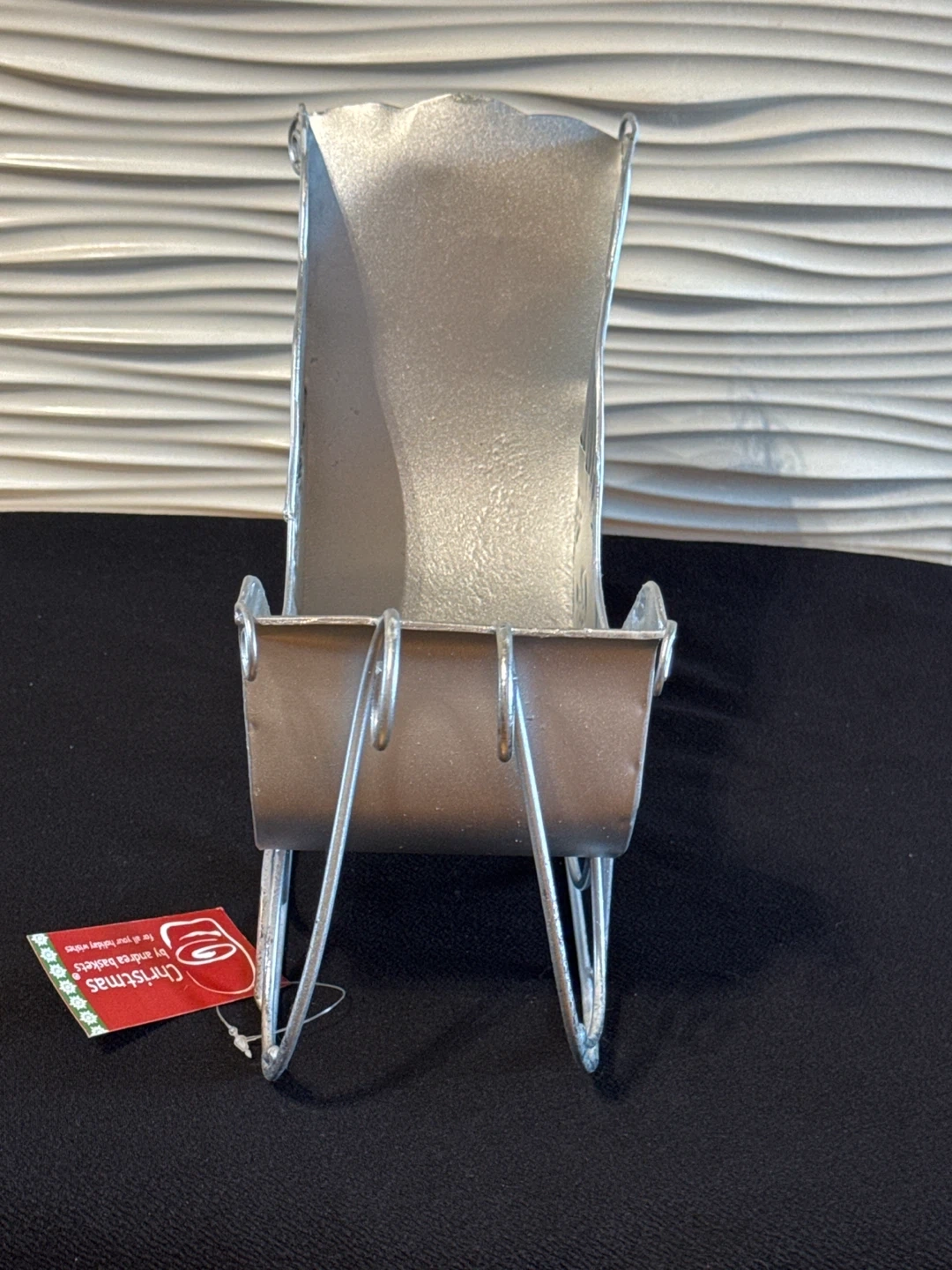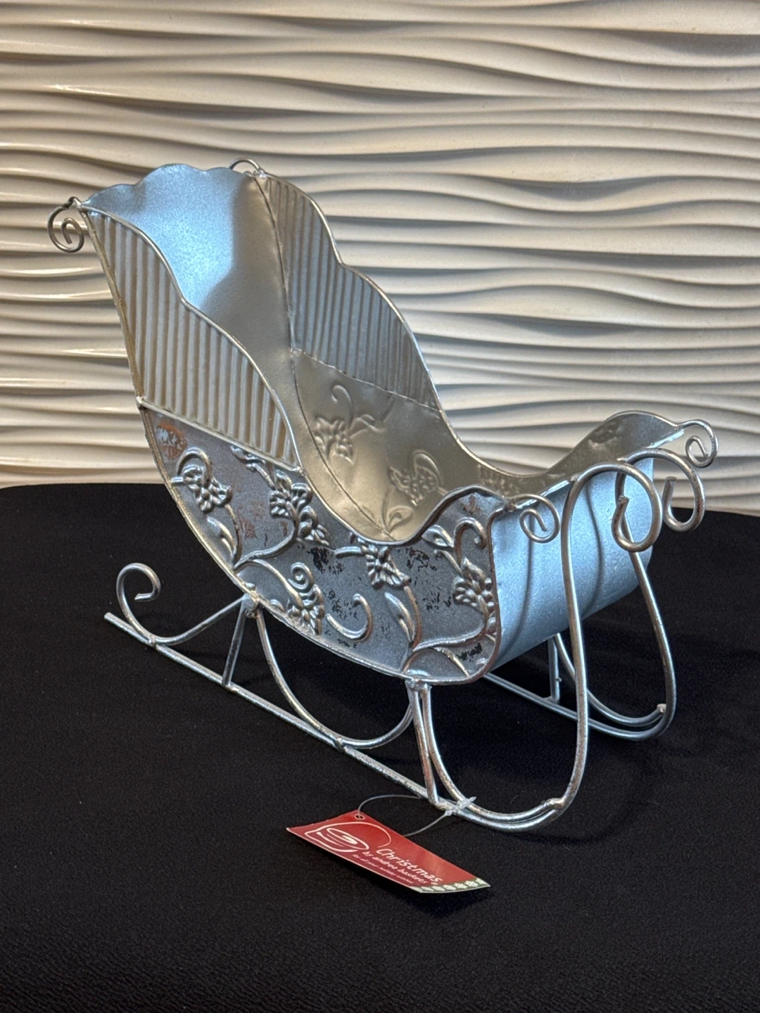This is a cute Christmas sleigh decoration. It's silver and has a beautiful design on the sides. Perfect for adding a touch of holiday cheer to your home