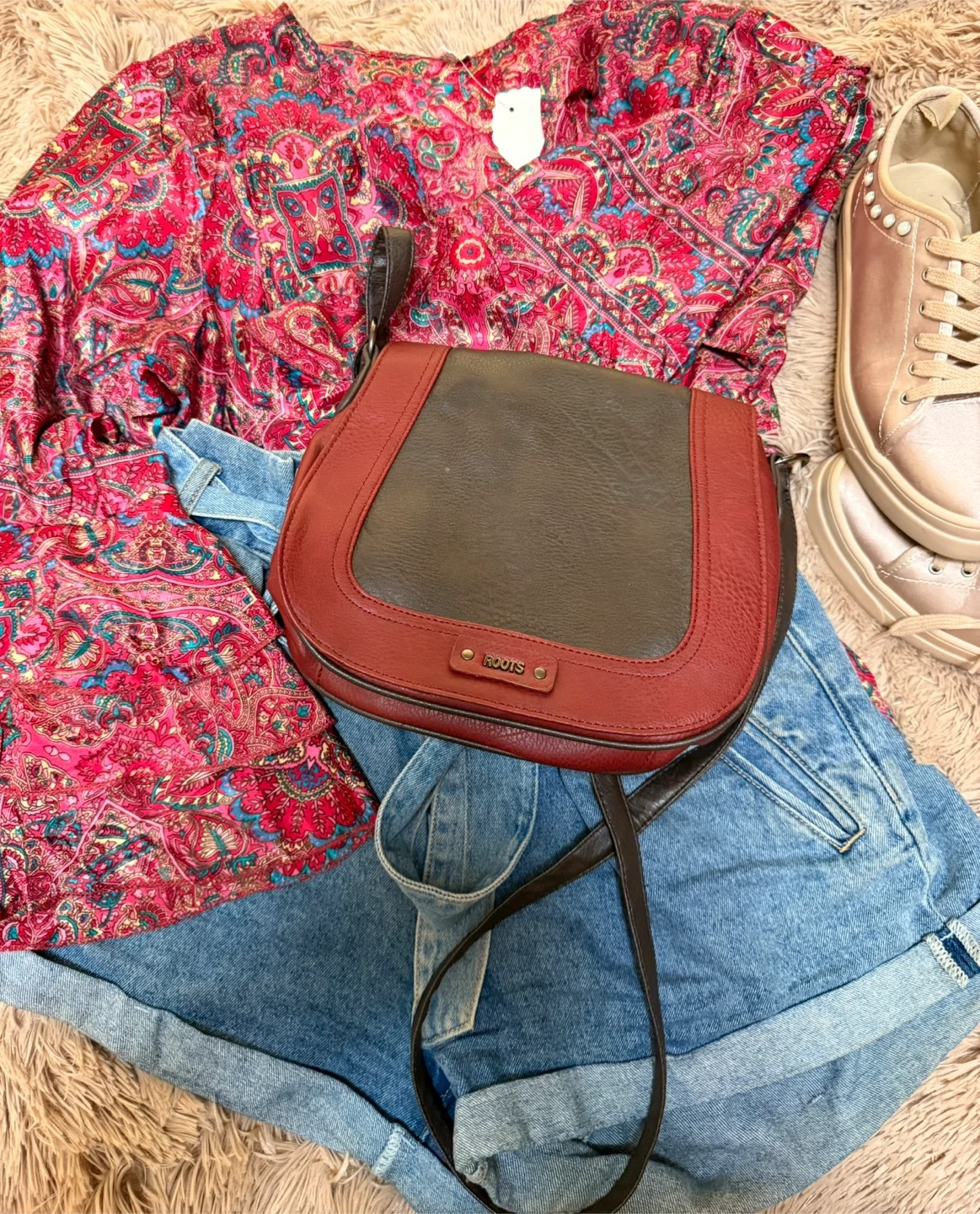 Roots Brown & Red Leather Crossbody Bag