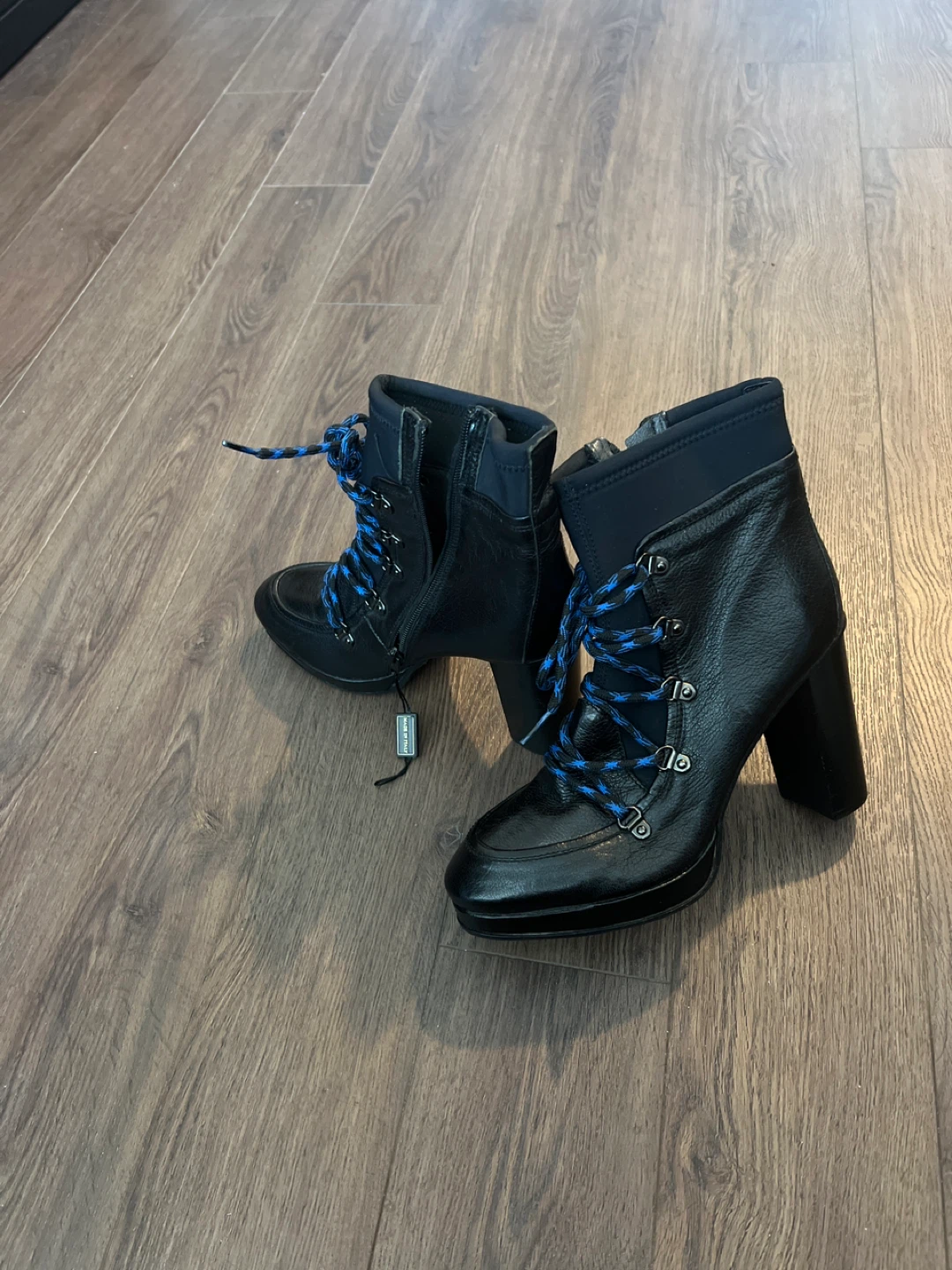 These are some stylish black leather ankle boots! They have a unique design with blue laces that really make them stand out. Perfect for adding a bit of edge to your outfit!