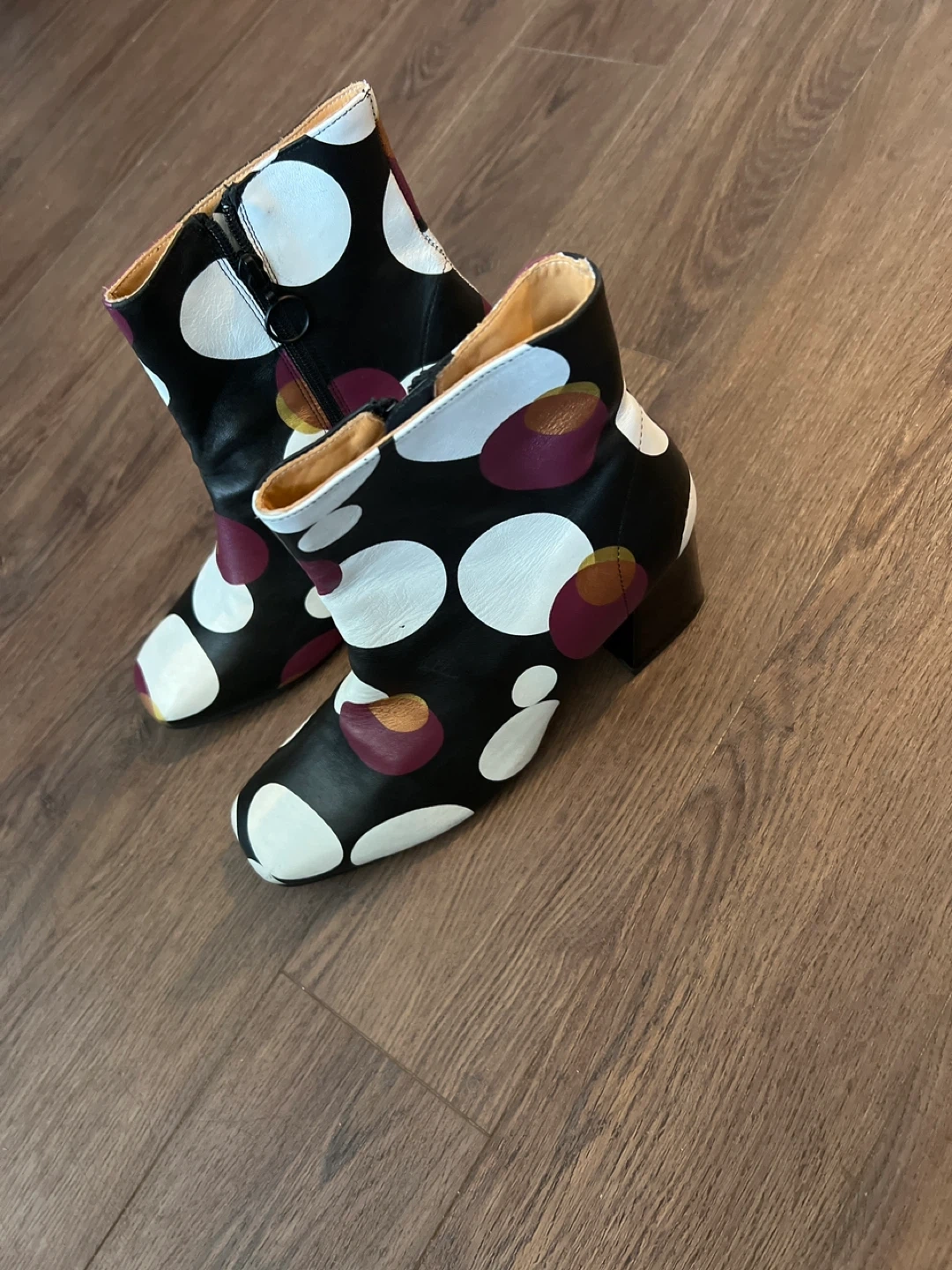 Cute and stylish polka dot ankle boots! They feature a unique design with black, white, and purple-ish dots. Perfect for adding a pop of fun to any outfit. Only worn once.