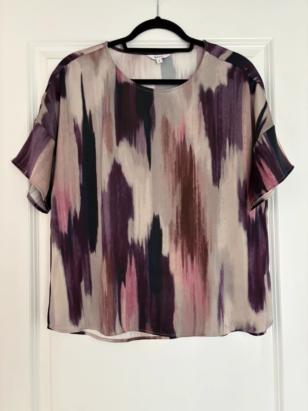 Selling a Reitmans top in size medium! The top has a unique abstract design with shades of purple, brown, and beige. It's in great condition and would be a lovely addition to any wardrobe