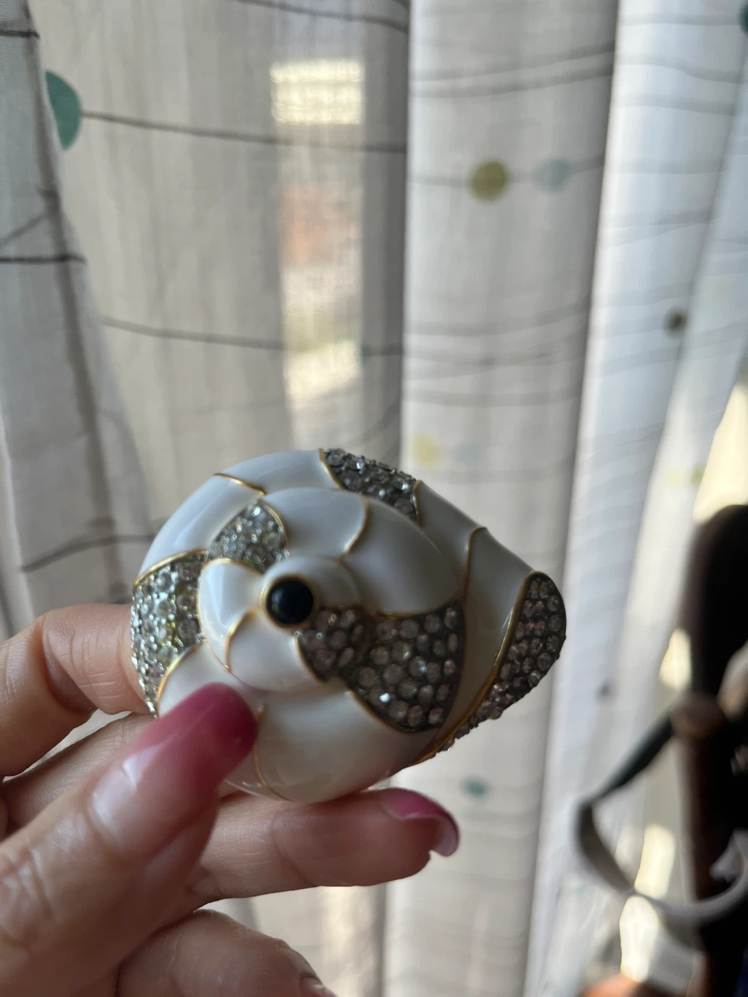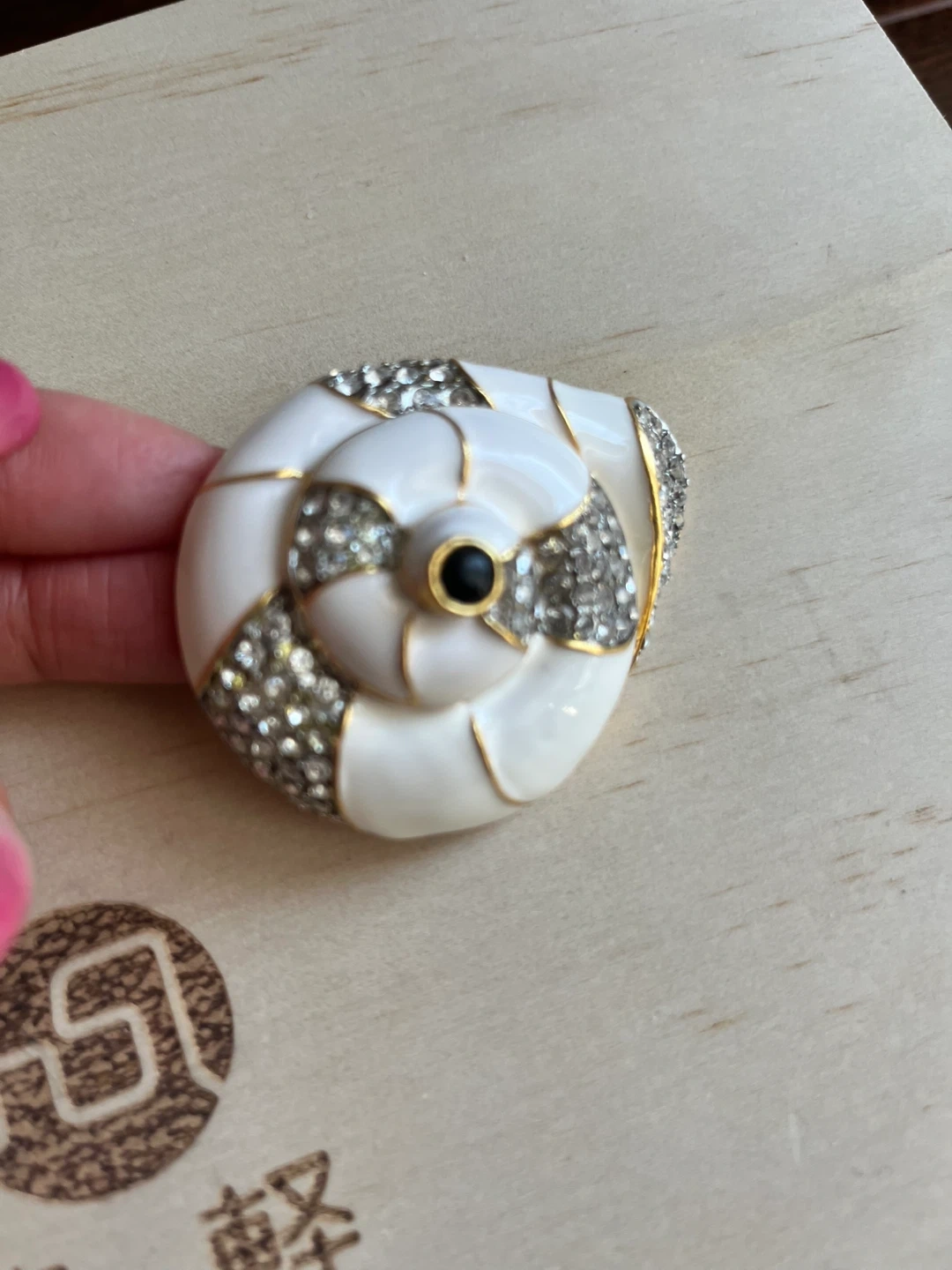Selling a vintage enamel clam shell trinket box! It's a beautiful piece with white enamel and sparkling rhinestones. Perfect for storing small treasures or as a decorative item on your vanity or shelf