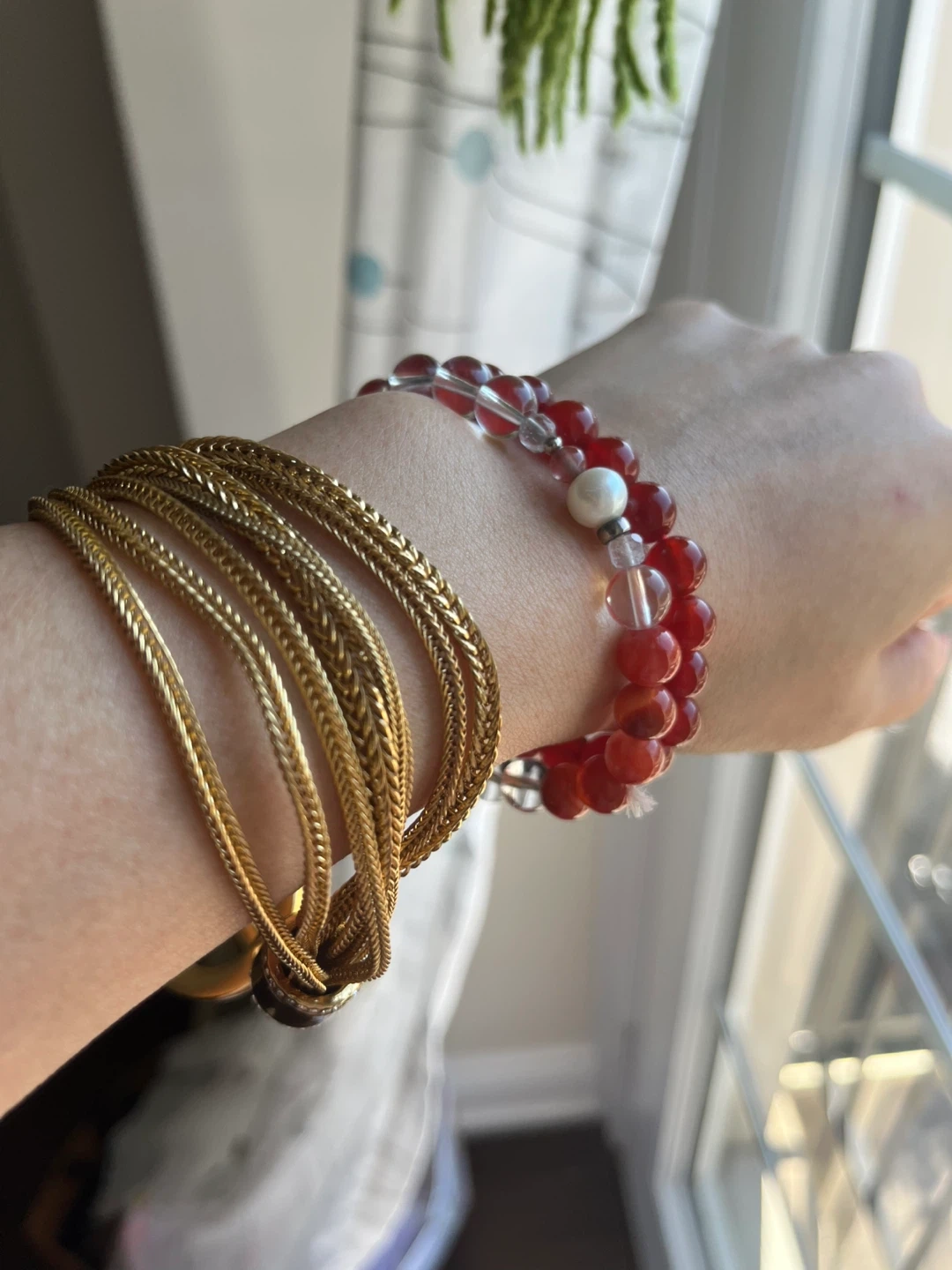 Selling a fashionable gold-tone bracelet. It features a unique design with crystal accents, adding a touch of sparkle to any outfit. This bracelet is perfect for dressing up or adding a bit of flair to your everyday look!