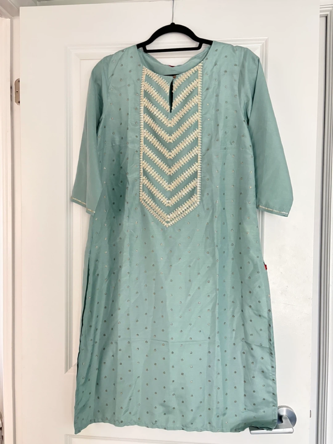 Selling a lovely teal-coloured kurti with delicate embroidery. It features a unique embroidered design around the neckline. Perfect for the festival season