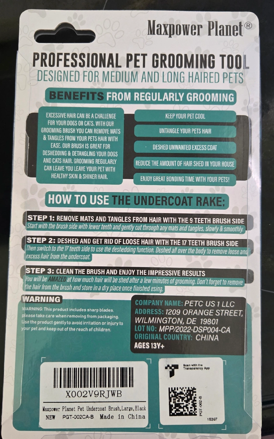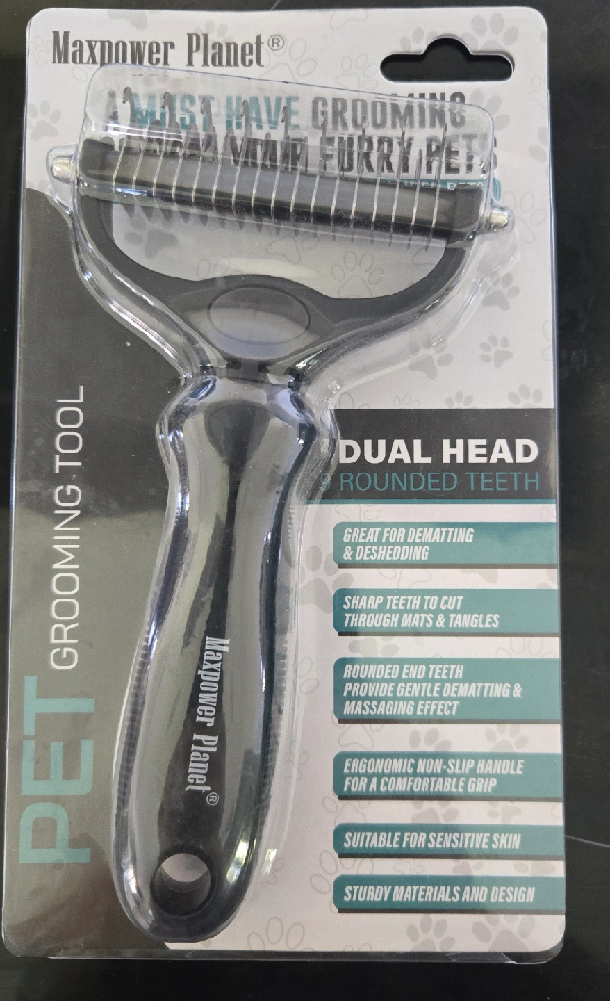 This is a Maxpower Planet pet grooming tool with a dual head and rounded teeth. It's designed for medium and long-haired pets and great for dematting and deshedding. It has sharp teeth to cut through tangles and an ergonomic non-slip handle for a comfortable grip. It is suitable for sensitive skin and made of sturdy materials and design