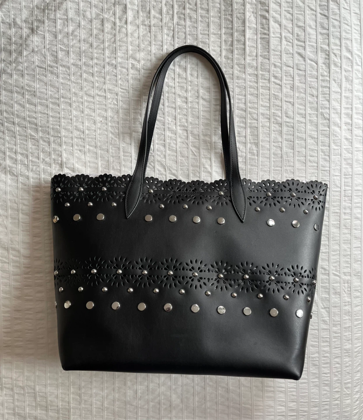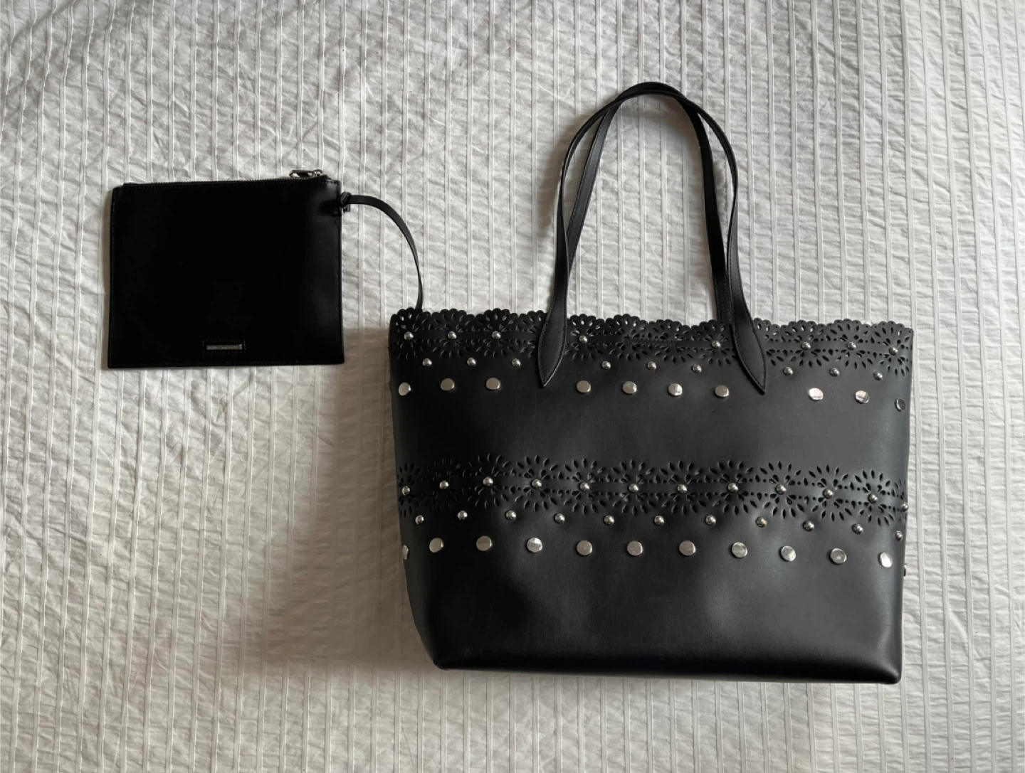The bag features a laser cut-out design and silver stud detailing. The structured leather has nice heft, and isn’t flimsy.