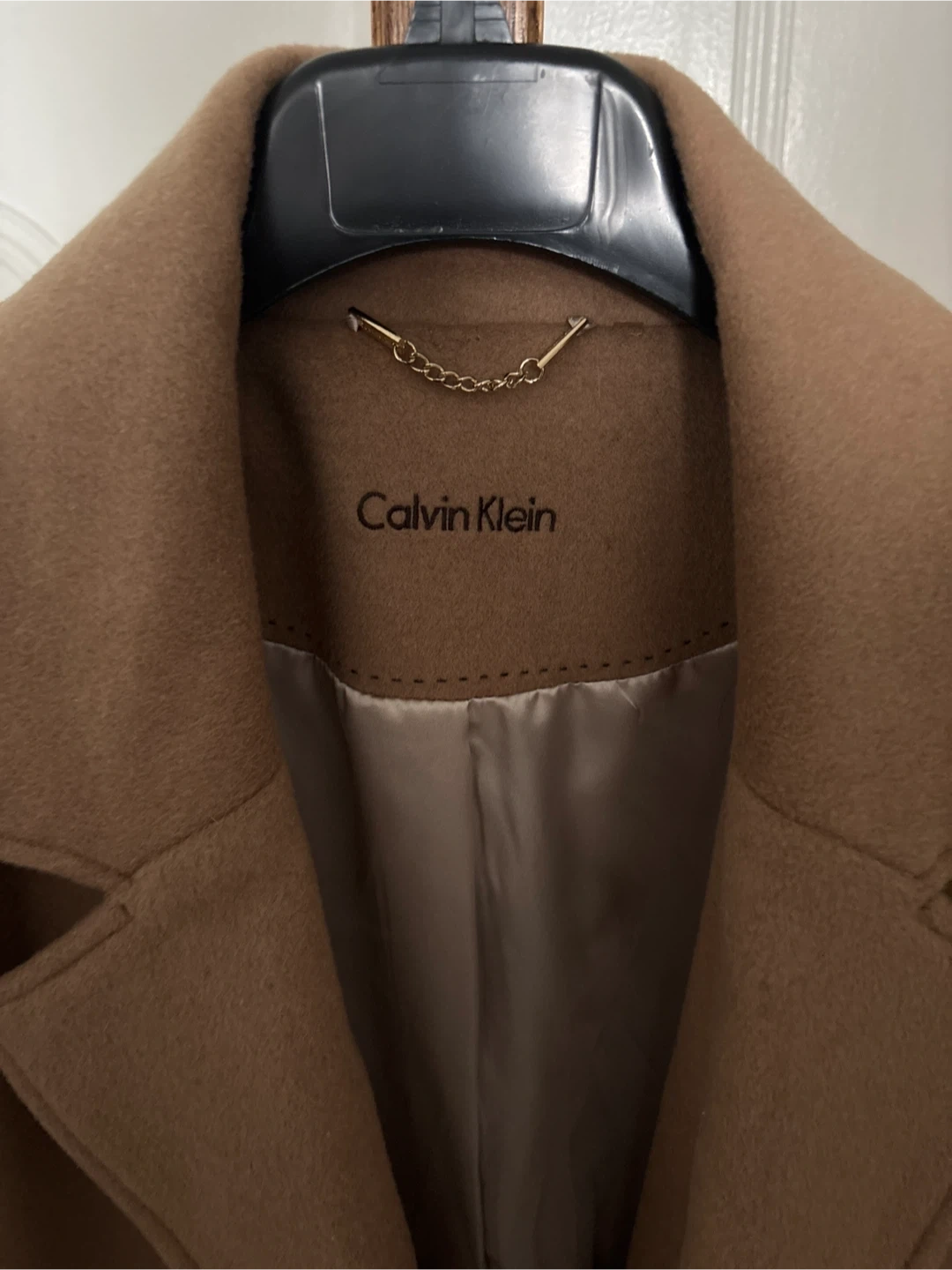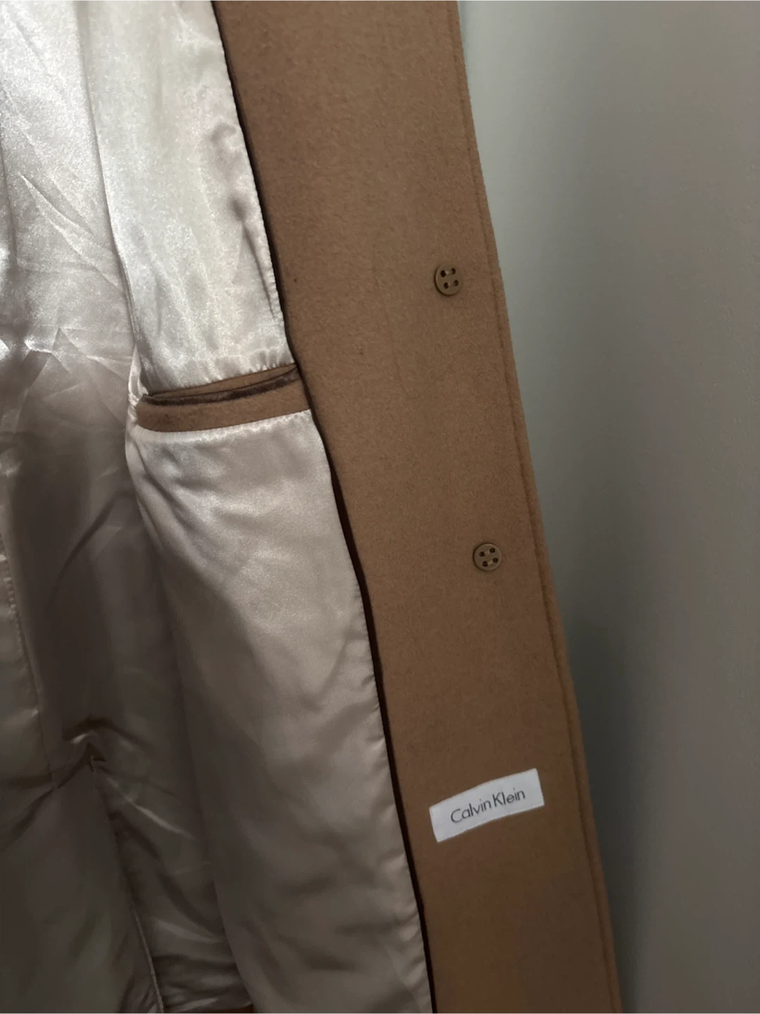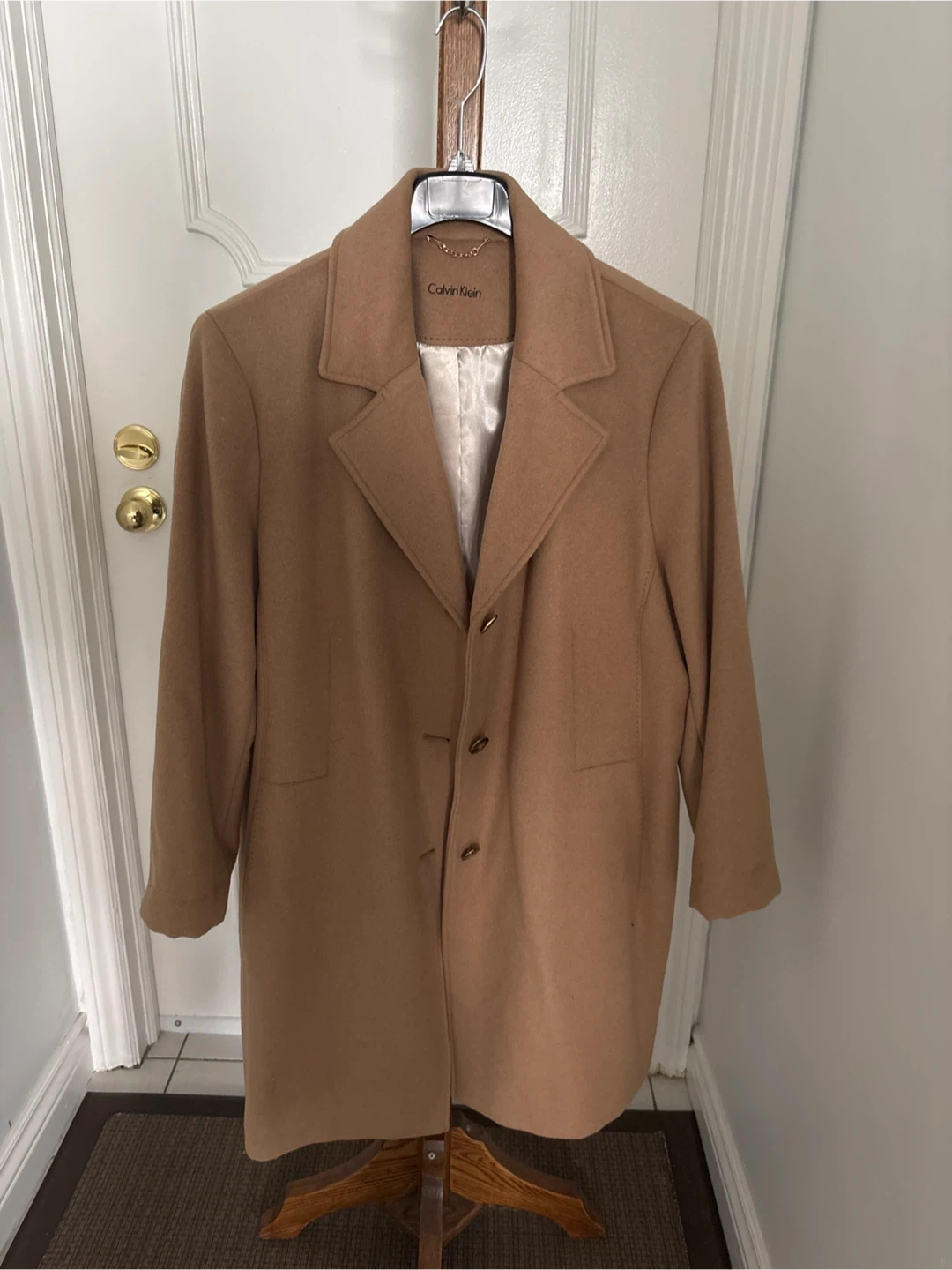 Selling a classic women’s camel coat from Calvin Klein. It's in great condition The material is a soft, warm wool blend, size 20 . Worn once.