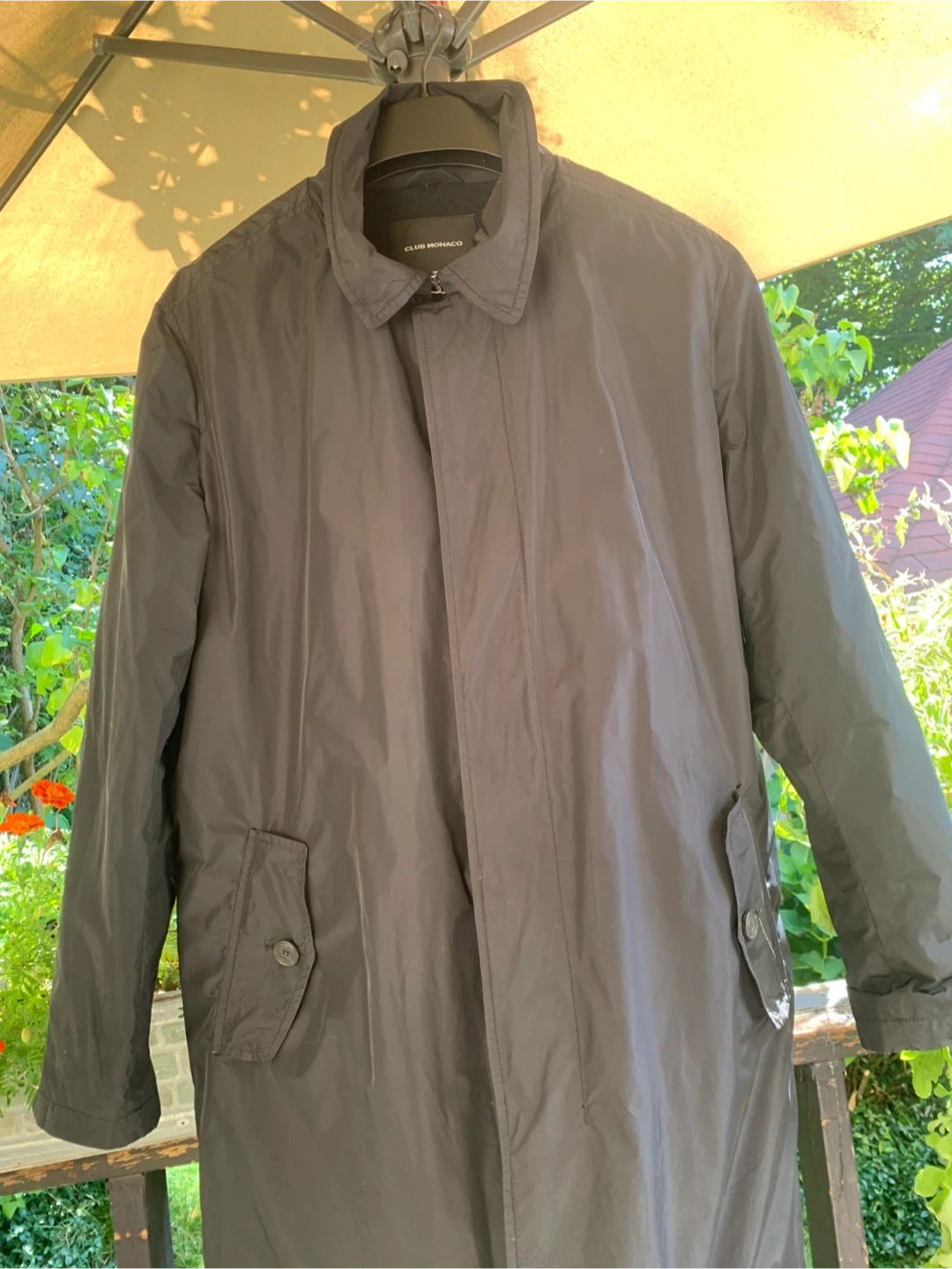 Selling a Club Monaco black rain coat in size XL. It's in great condition and ready to keep you dry during those rainy days! The material is a blend of polyester and nylon, making it lightweight and durable