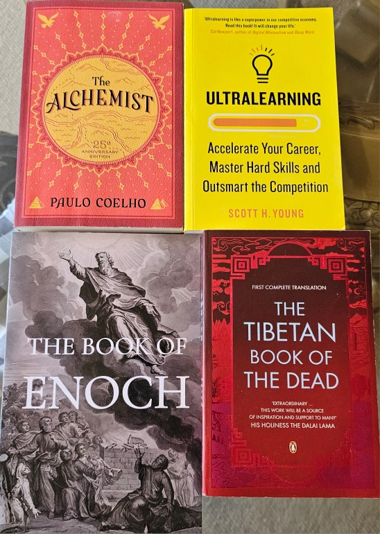 Selling a set of four books! Includes: - The Alchemist by Paulo Coelho (25th Anniversary Edition) - Ultralearning by Scott H Young - The Book of Enoch - The Tibetan Book of the Dead (First Complete Translation)