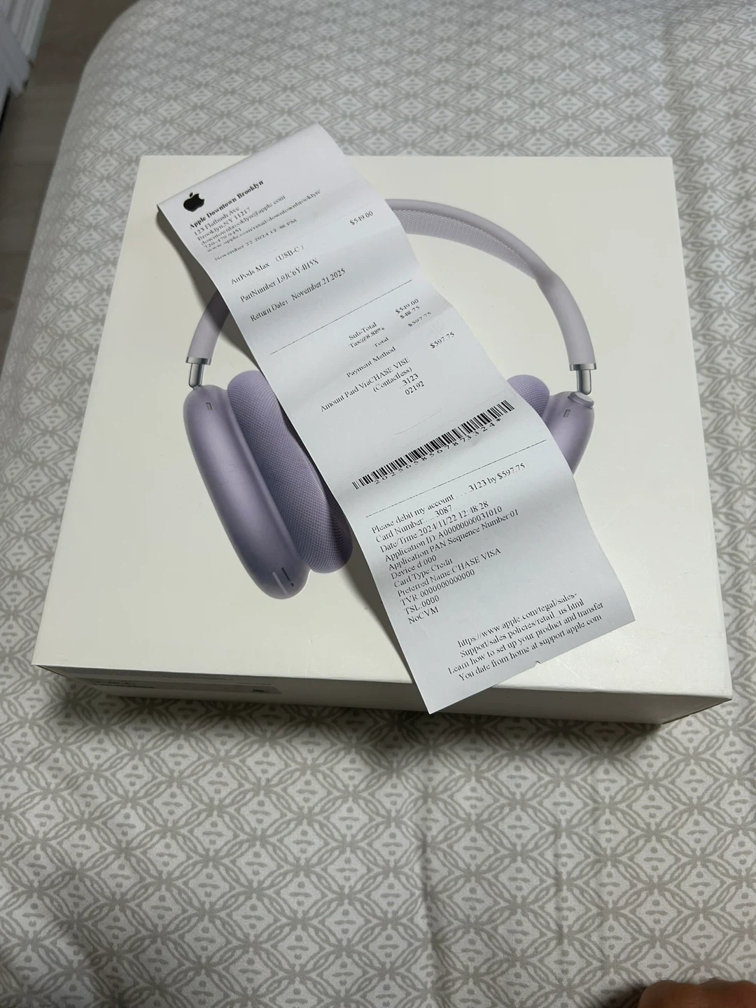 65Selling brand new Apple AirPods Max in purple! They come in the original box. The receipt shows they were originally $599.00 plus tax, so $677.77 total. Never been opened!