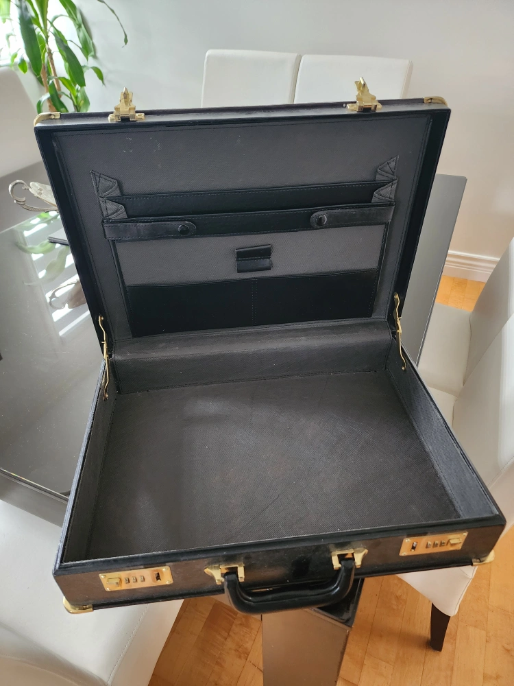 Selling a black leather briefcase. It features combination locks for added security. The interior has compartments for organization. Great for professionals or anyone needing a secure way to carry documents and valuables