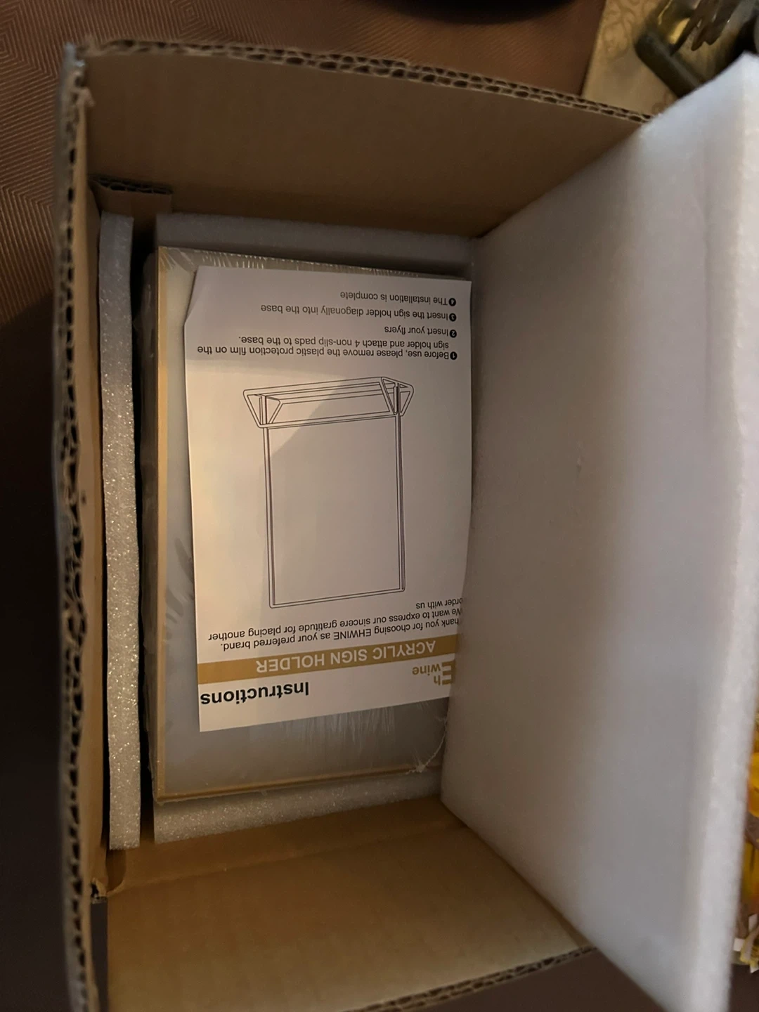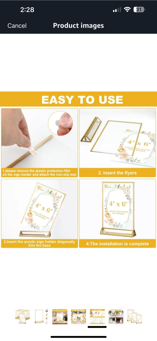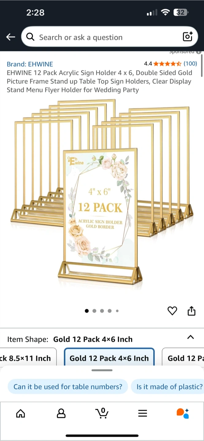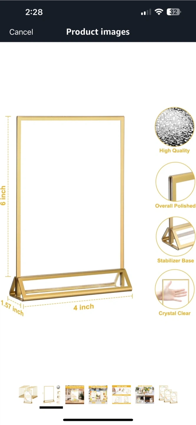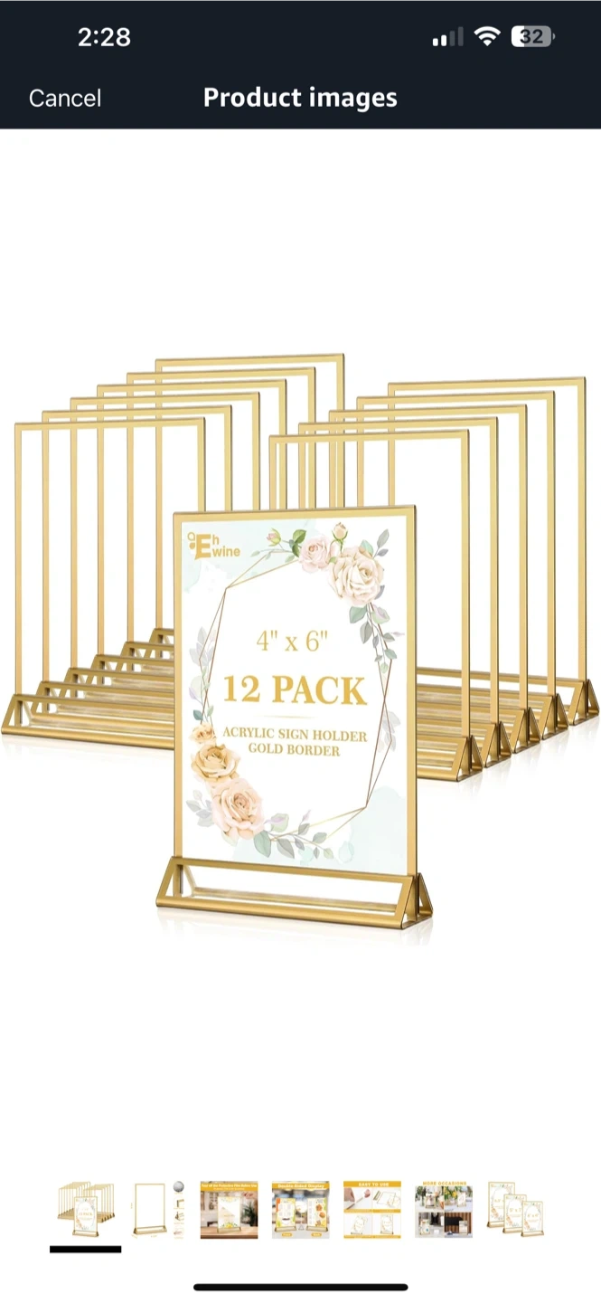 I'm selling a 12-pack of EHWINE acrylic sign holders. They're gold-bordered and perfect for displaying 4" x 6" signs. These sign holders are made with high-quality materials and feature a stabilizer base to keep them upright. They are crystal clear and overall polished. Original price is $40.36 Brand new in box