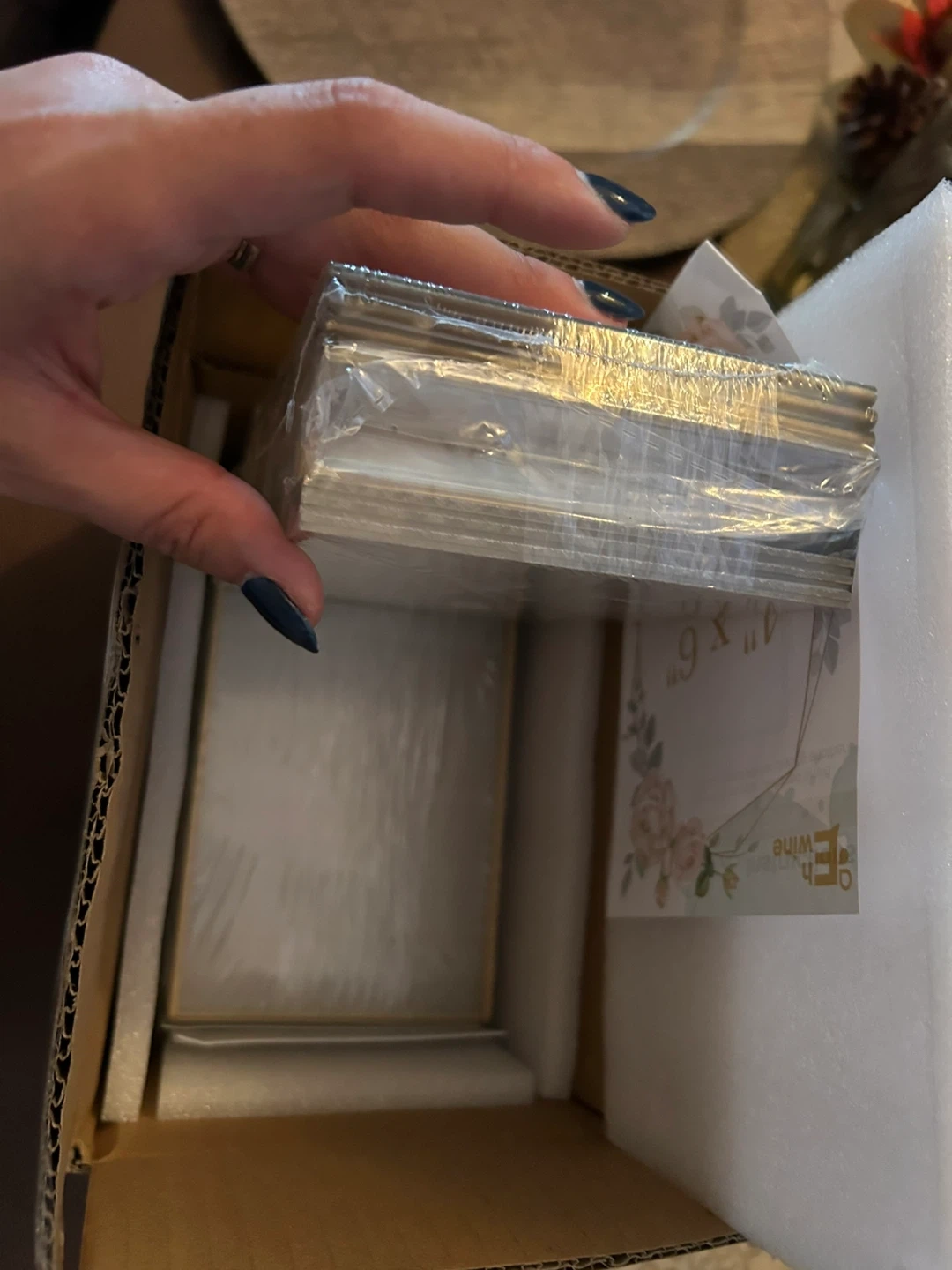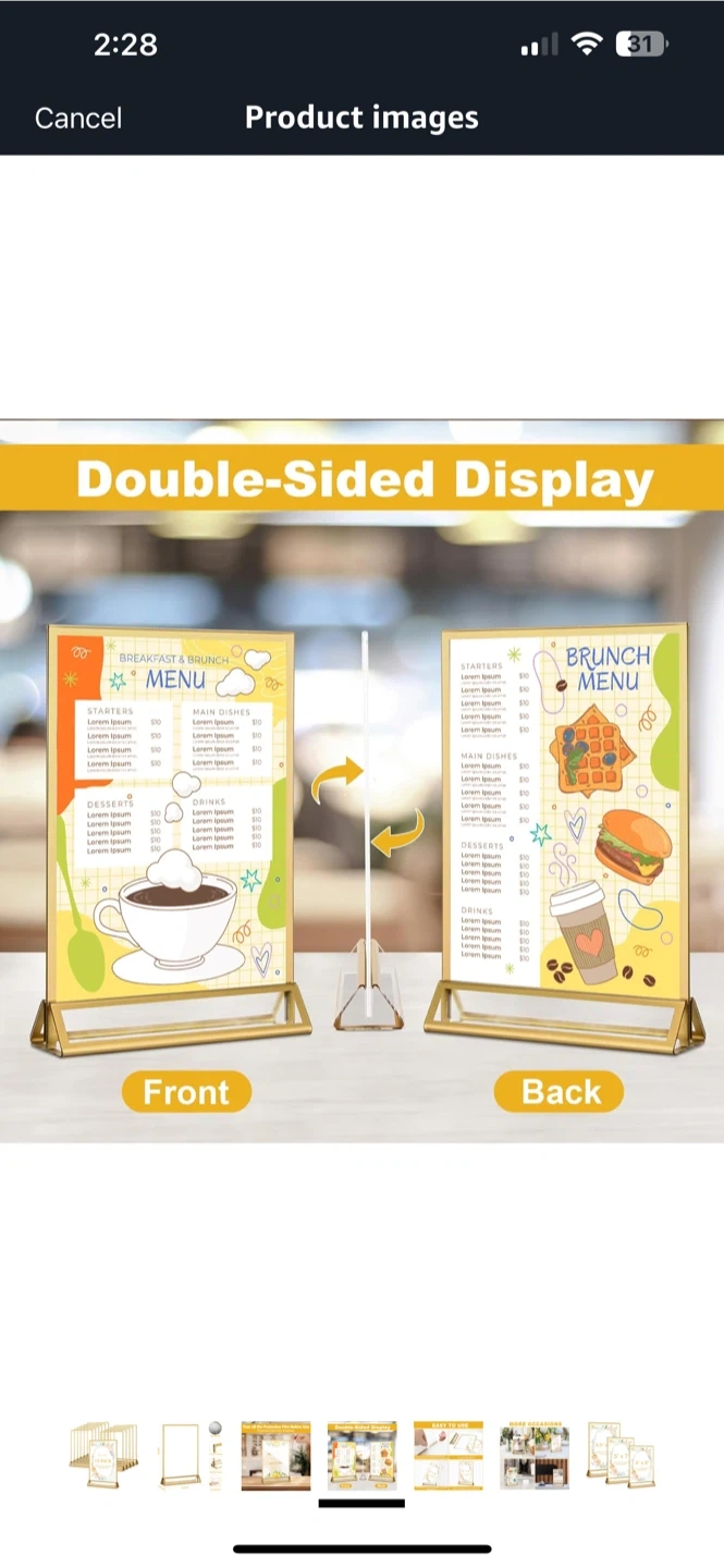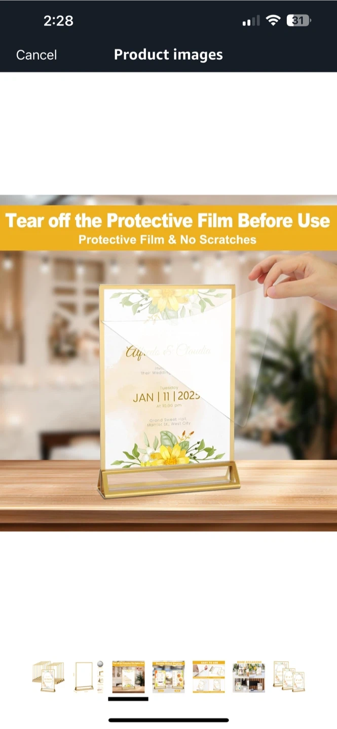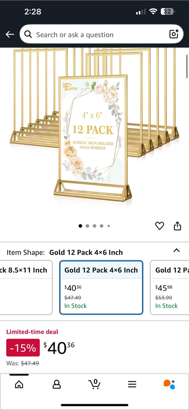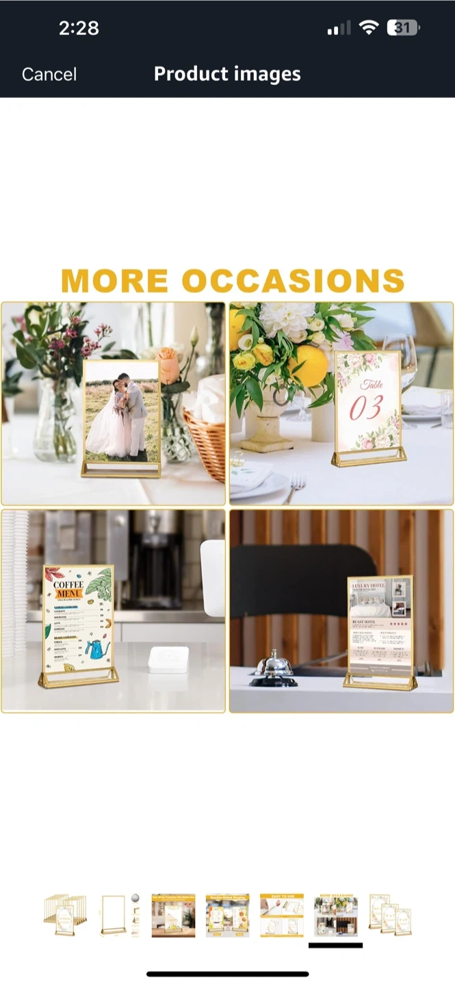 I'm selling a 12-pack of EHWINE acrylic sign holders. They're gold-bordered and perfect for displaying 4" x 6" signs. These sign holders are made with high-quality materials and feature a stabilizer base to keep them upright. They are crystal clear and overall polished. Original price is $40.36 Brand new in box