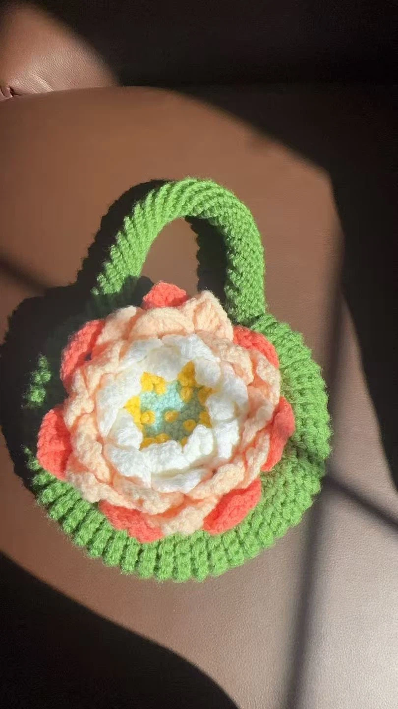 Check out this adorable handmade crochet mini bag! It features a beautiful flower design in white, peach, and yellow, surrounded by a vibrant green base and handle. Perfect for adding a touch of whimsy to any outfit!