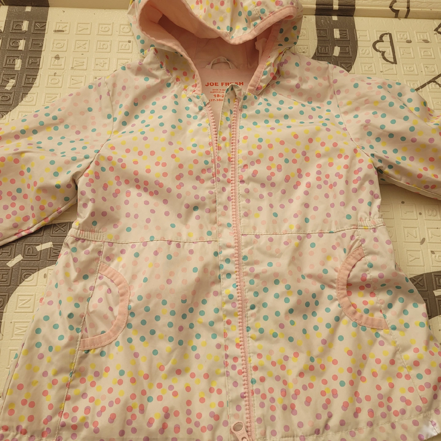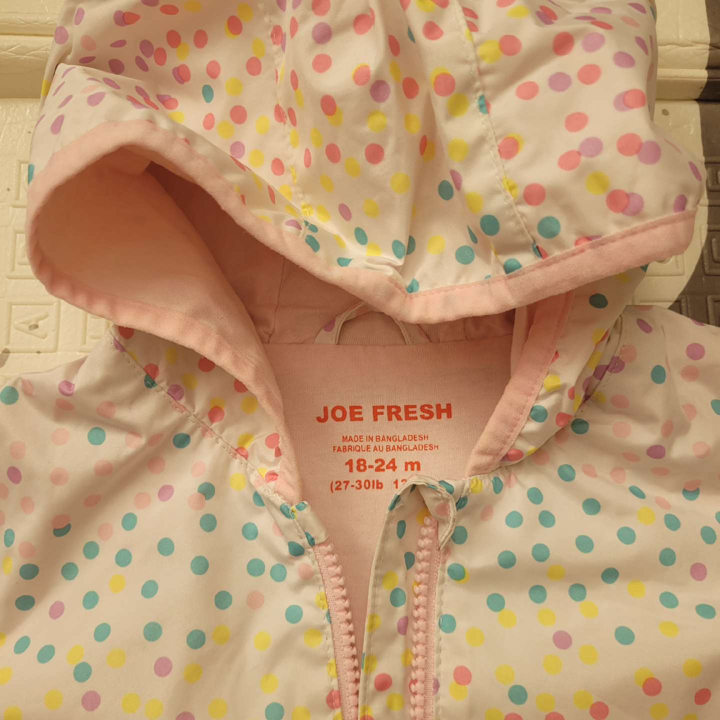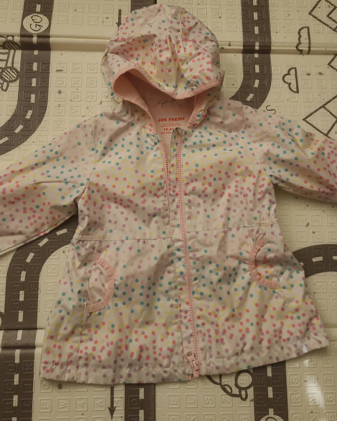 This cute Joe Fresh baby jacket is perfect for those rainy days! It features a fun polka dot pattern and a cozy hood. Size is 18-24 months and in great condition