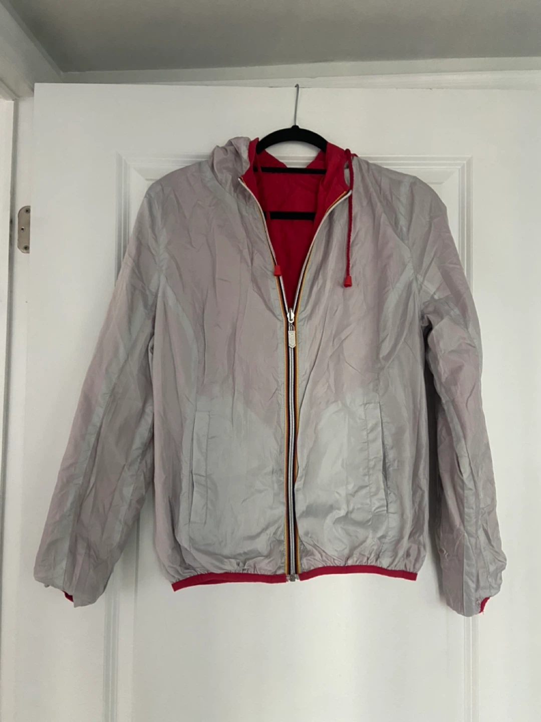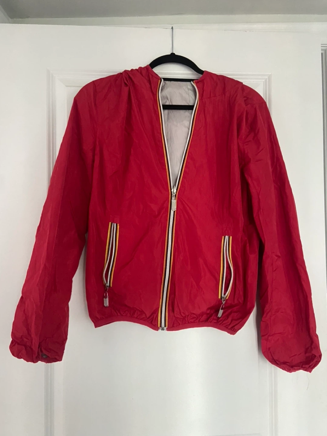 Selling a reversible jacket in red and gray. It's lightweight and packs into a small pouch, making it perfect for travel, outdoor activities or unexpected downpours.