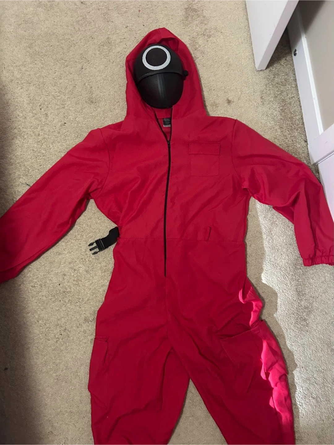 Selling a Squid Game costume! It includes a red jumpsuit with pockets and a zipper, plus the iconic black mask with the white circle. Perfect for Halloween or any costume party! Size for adult.
