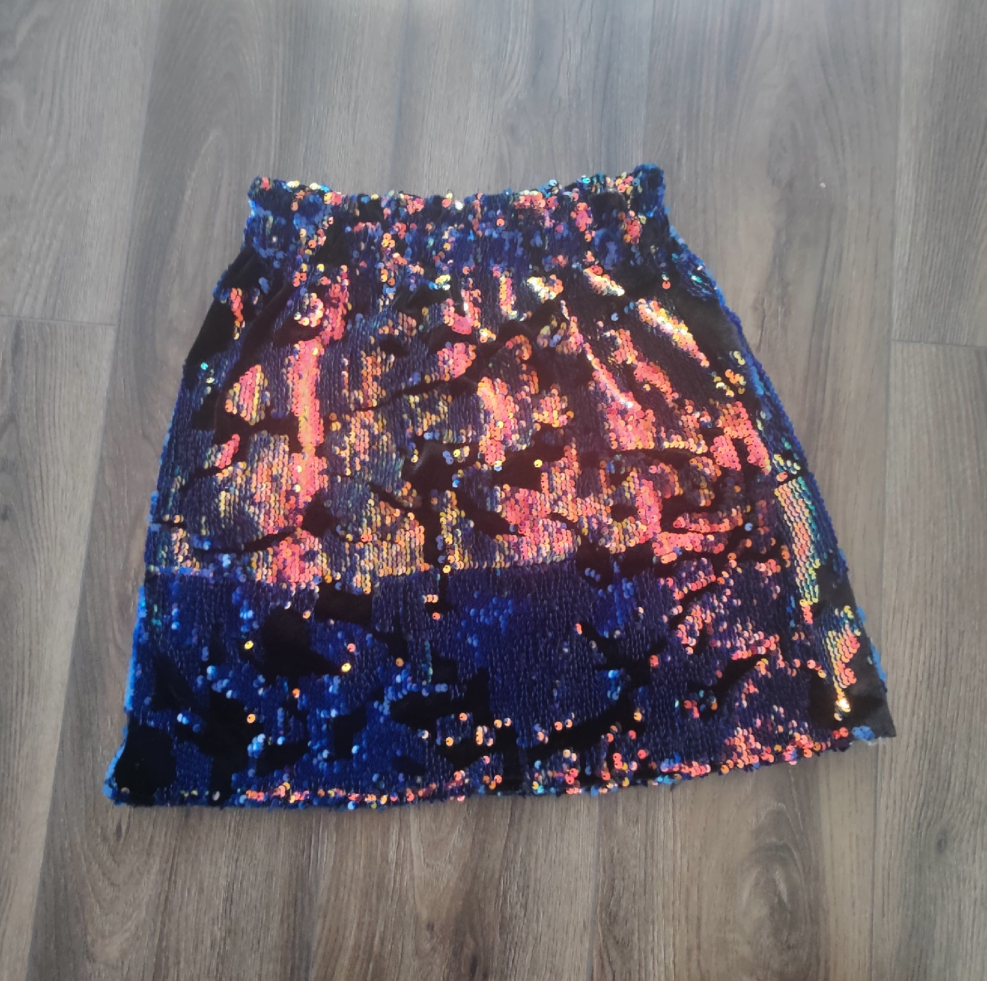 Sparkly sequin mini skirt, perfect for a night out or a fun party! The sequins are a mix of blue, pink, and gold, creating a really eye-catching effect. It has an elastic waistband for a comfortable fit. Worn once. Fits a S & M.