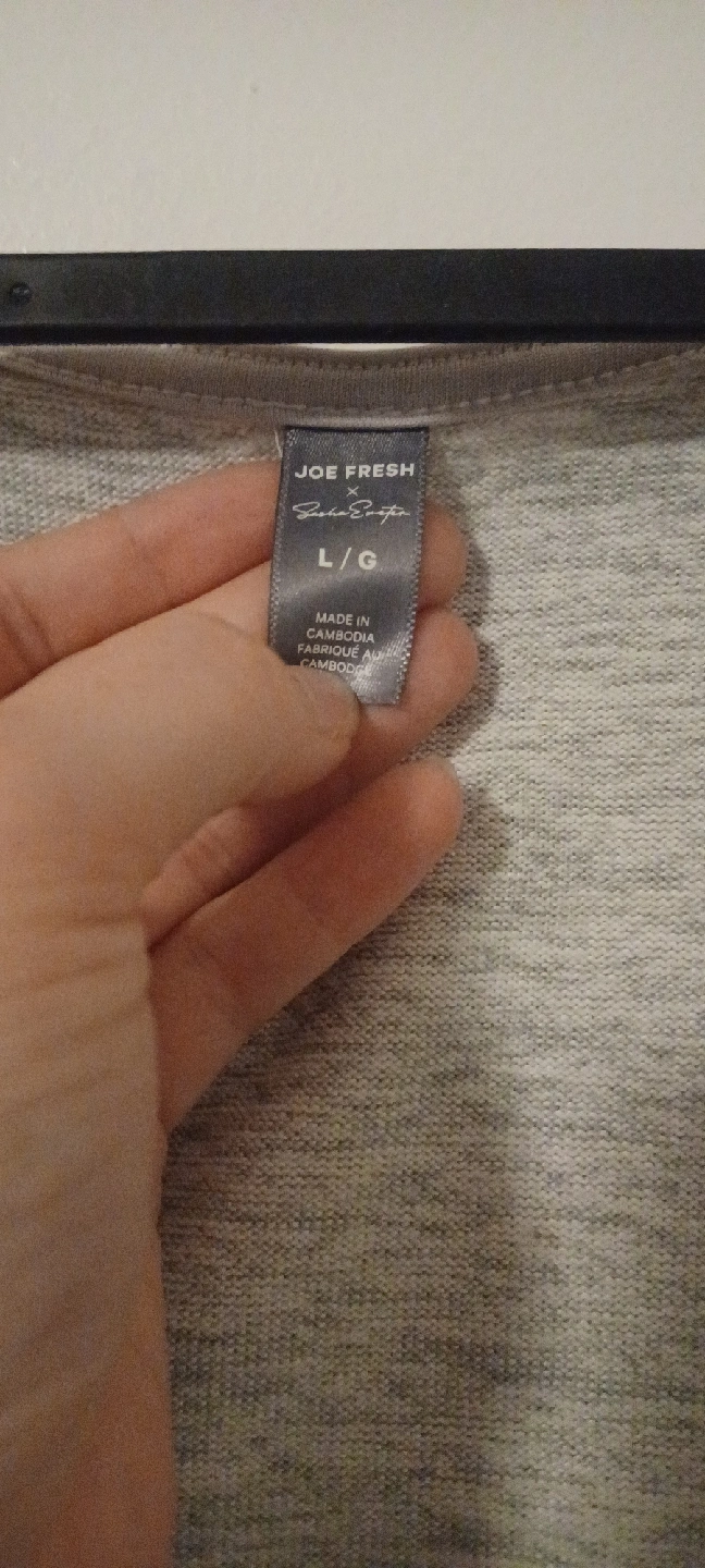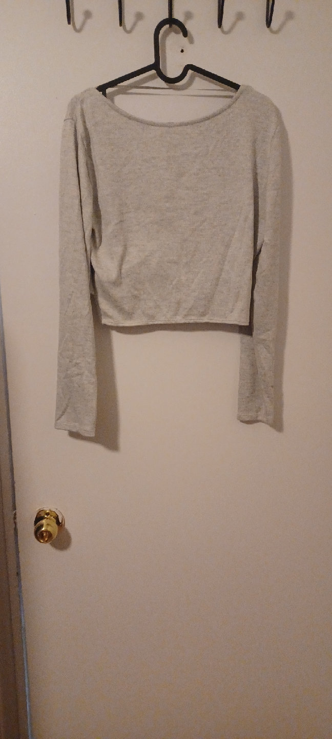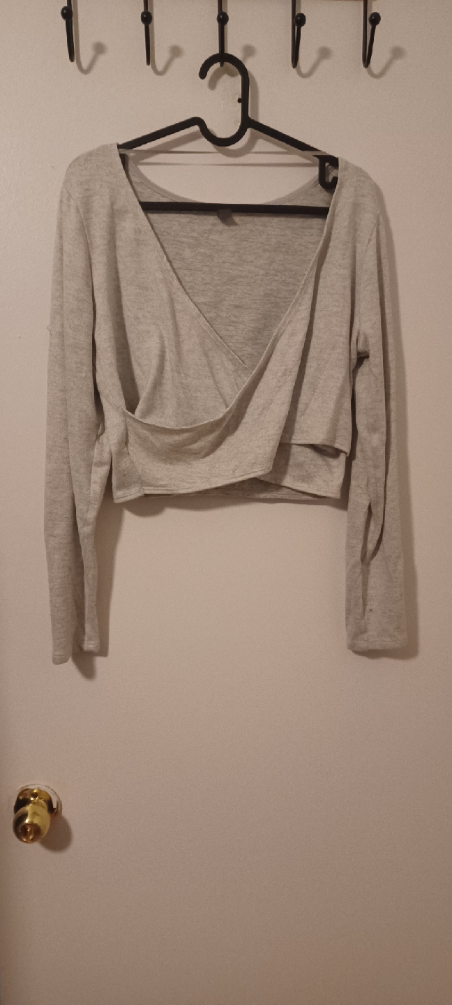 Selling a cute Joe Fresh wrap top in size large! It's a light grey colour and has long sleeves. Perfect for layering or wearing on its own!