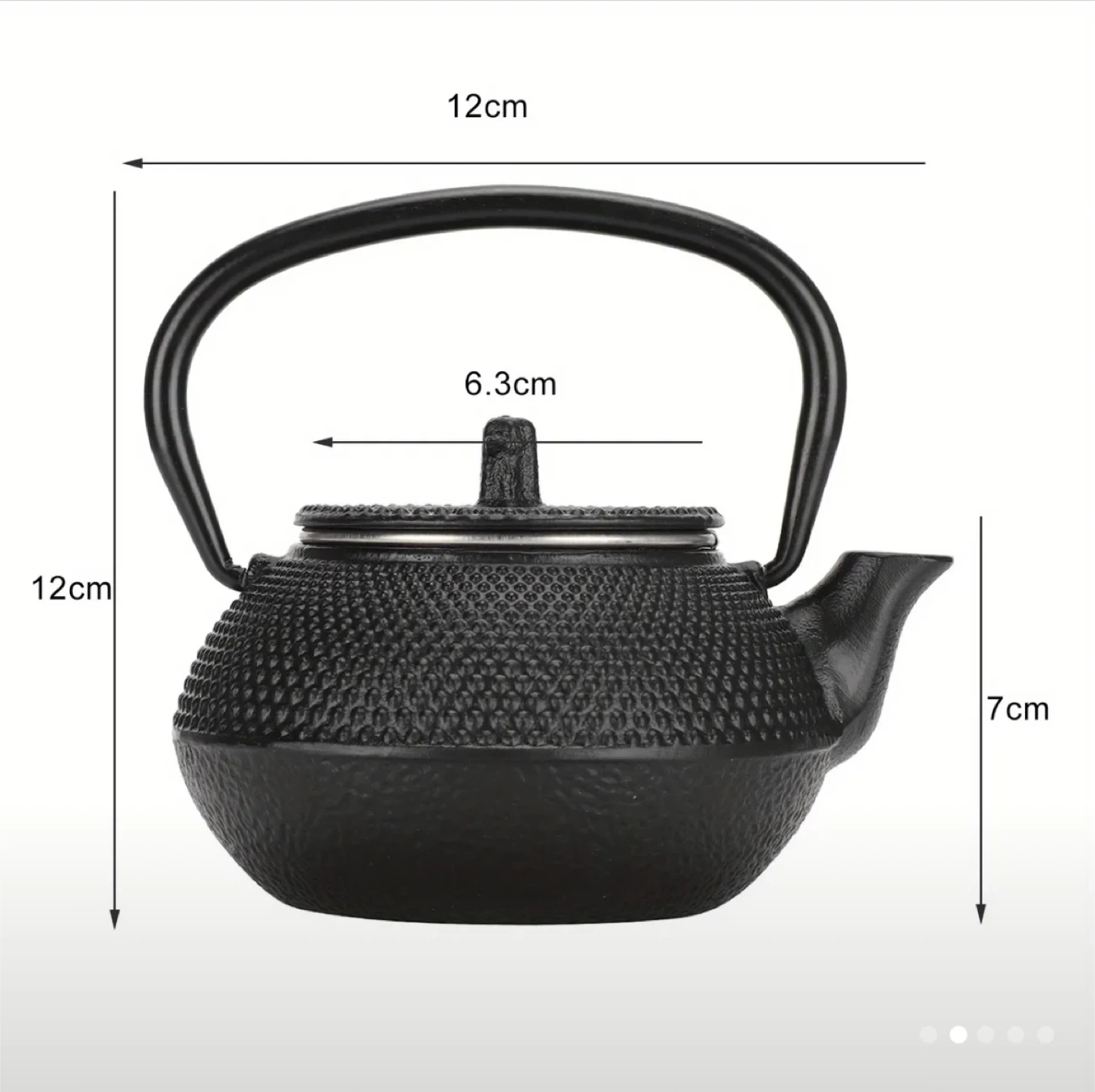 0.3L Cast Iron Tea Kettle with Strainer – Japanese-Inspired Design, Black Textured Teapot for Home or Tea House, Fine Craftsmanship with Plum Blossom Detailing and Smooth Spout.