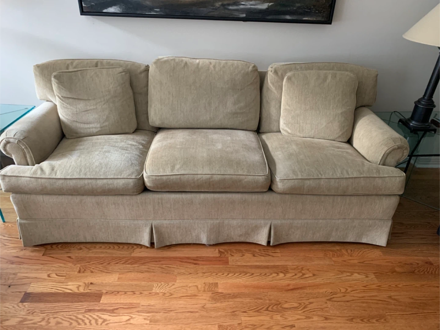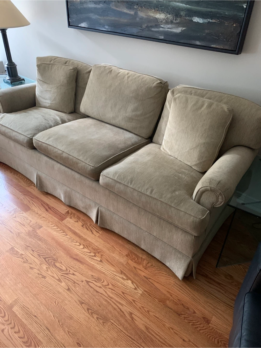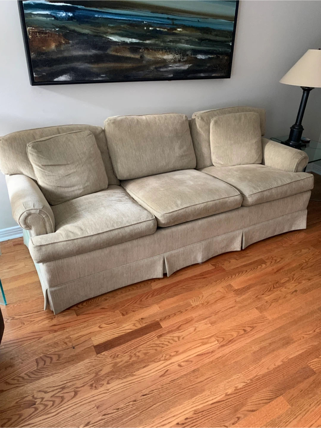 Selling a comfy beige sofa. It's in good condition and ready for a new home! Perfect for a living room or den, it offers plenty of seating space for family and friends. This sofa is sure to add a touch of warmth and relaxation to any space