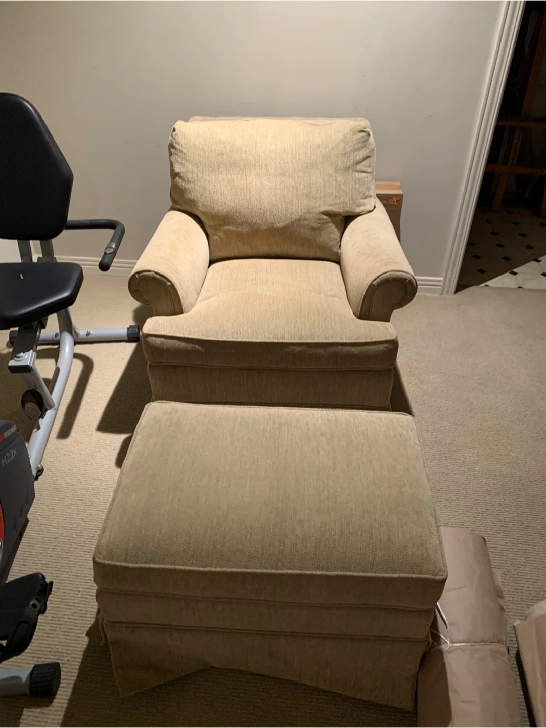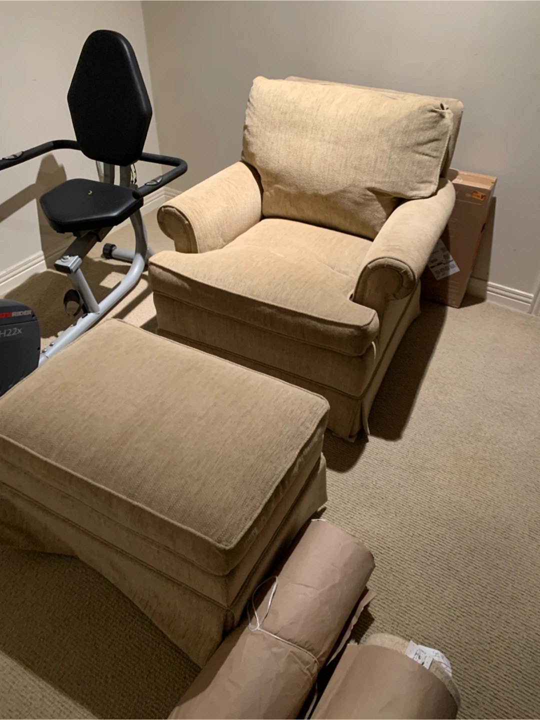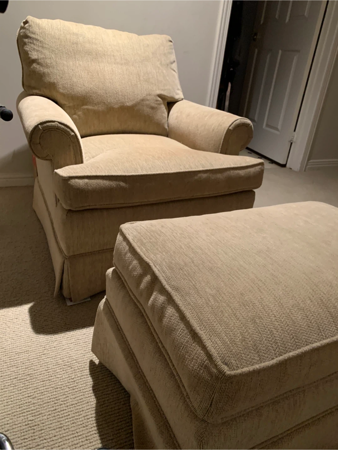 Comfortable armchair and ottoman set in a neutral beige colour. Perfect for adding a cozy touch to your living room or den. In good condition and ready for a new home! Matches the couch I also have available