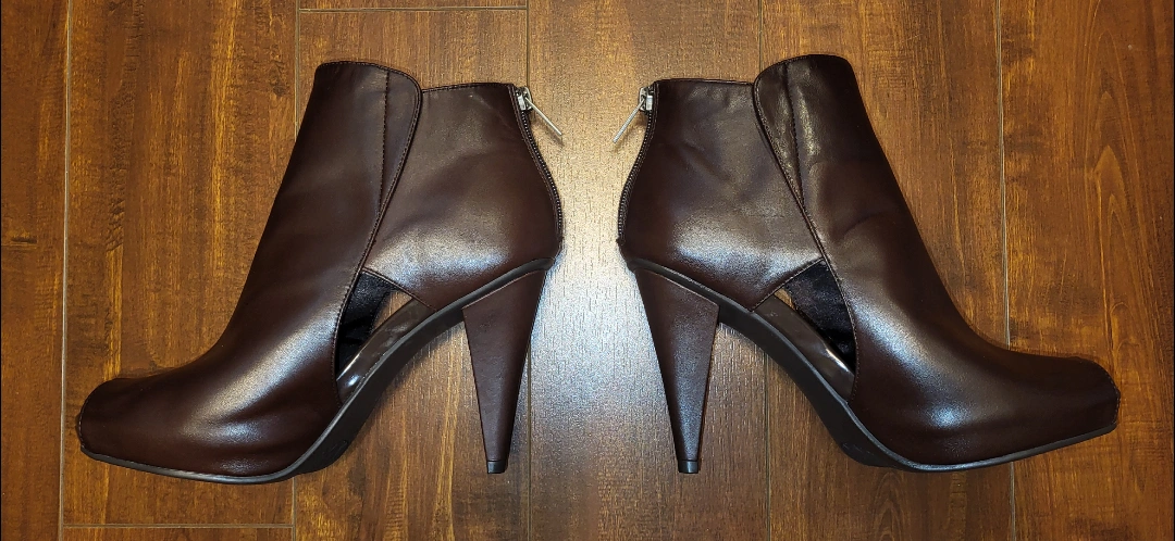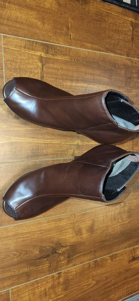 Kenneth Cole Reaction leather, zip up, peep toe booties, brown, platform, cone heels, 4", size 7.5.