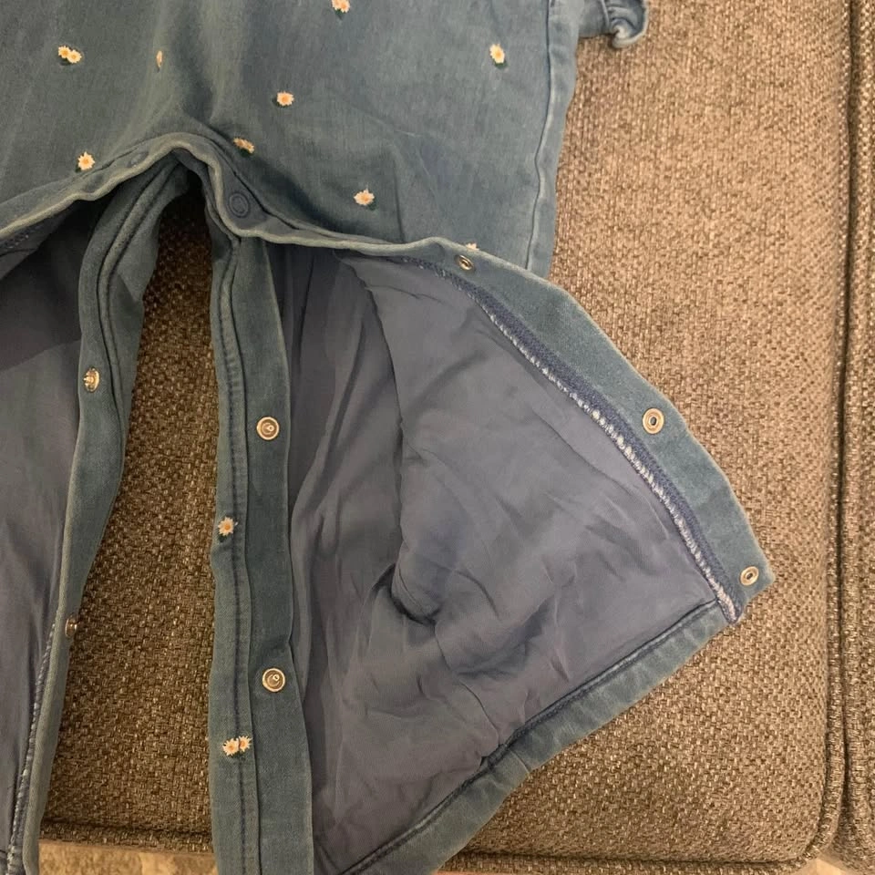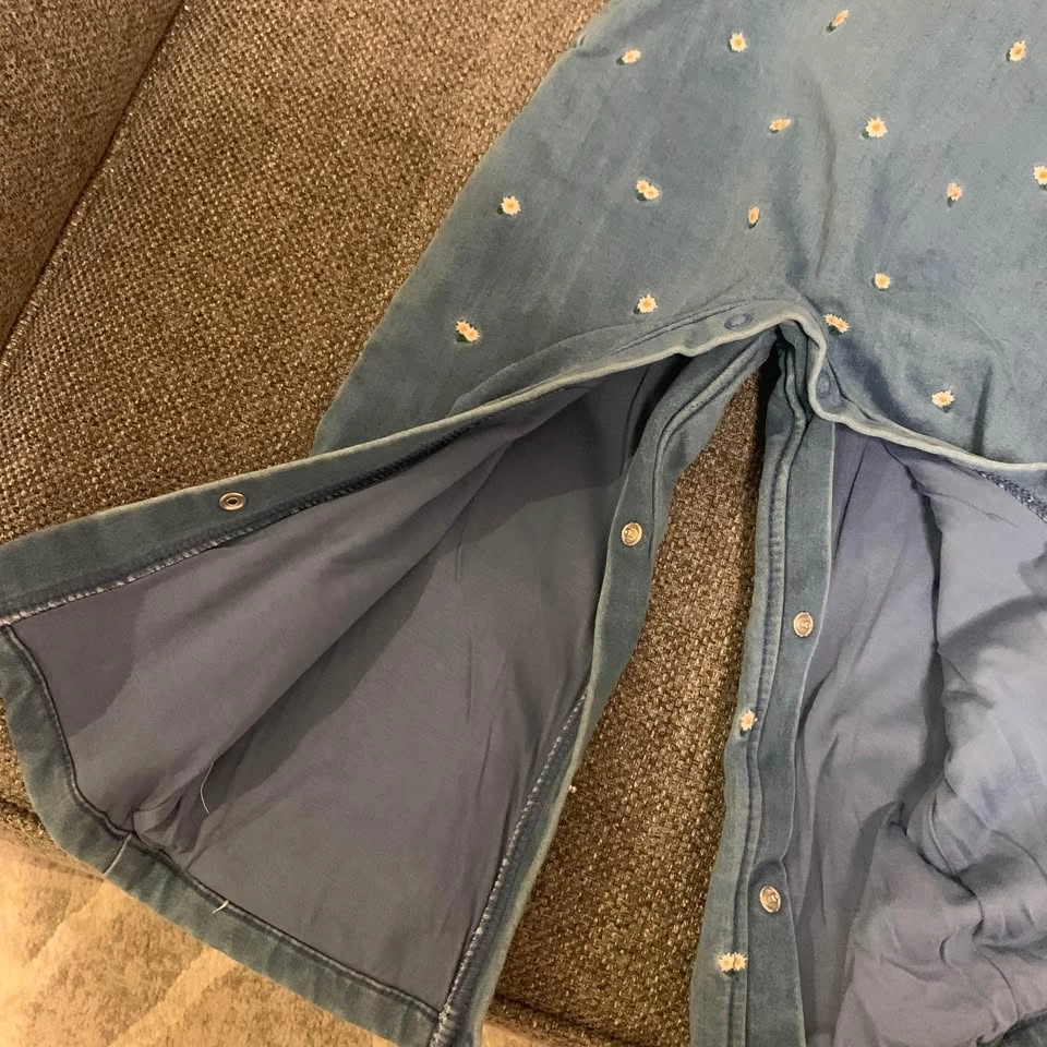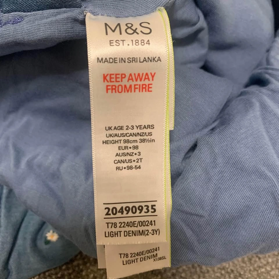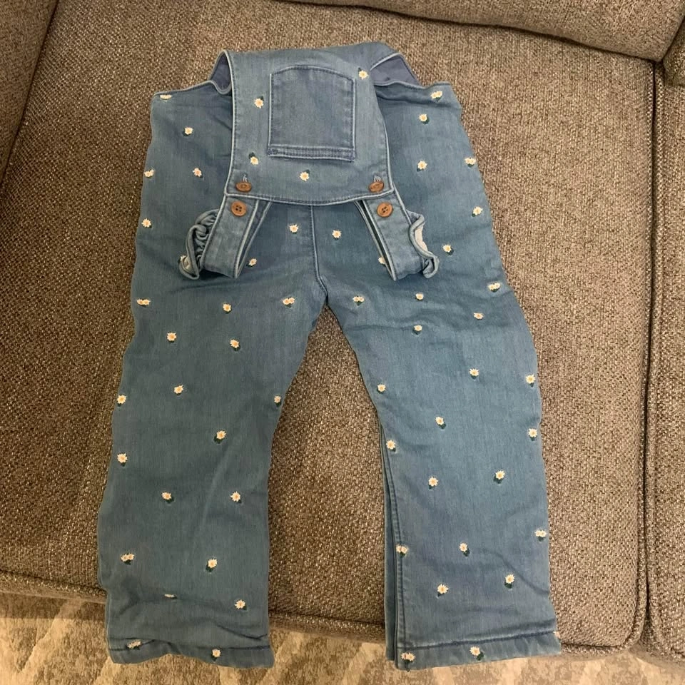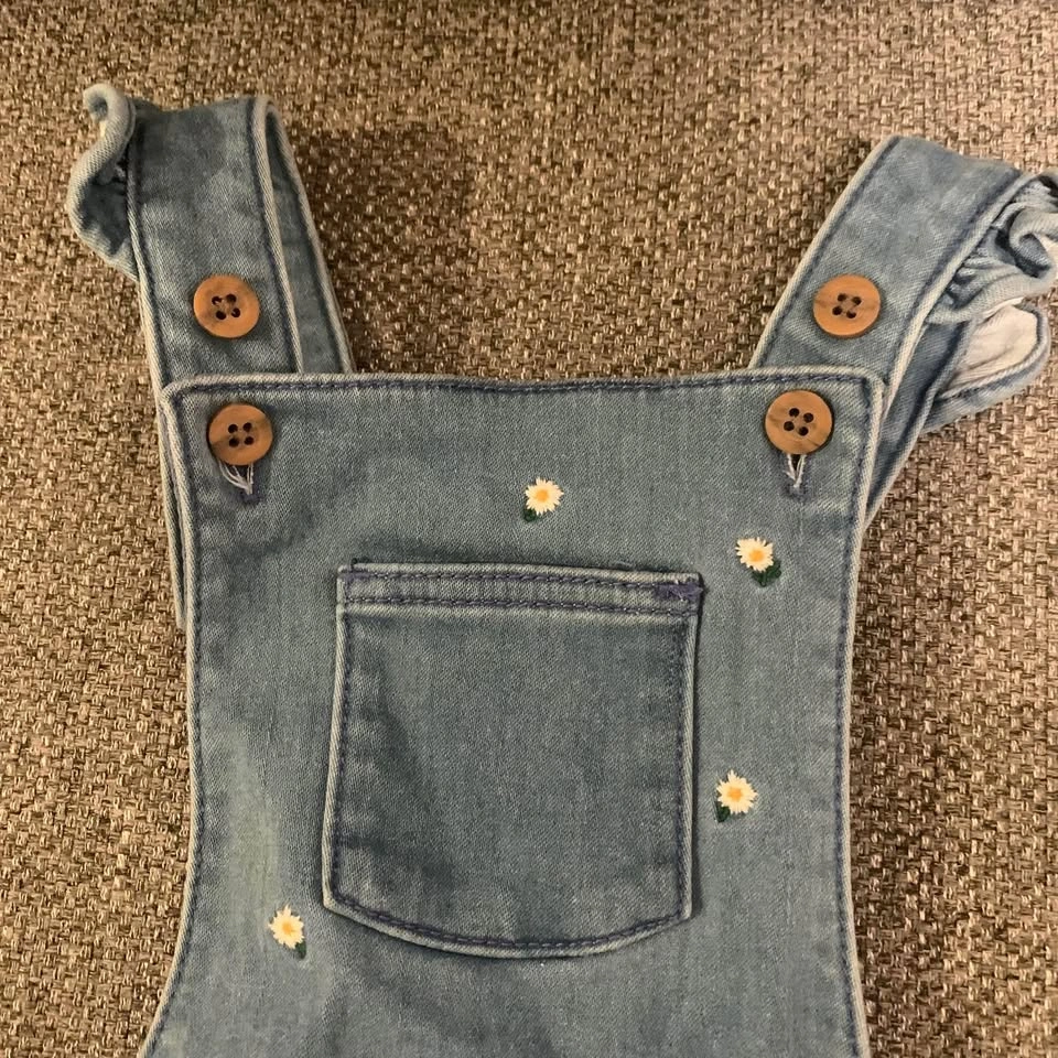 Mark and Spencer 2-3yo girl denim overalls with floral embroidery patterns. 99% new. In excellent condition. Only wore a few times. Bought from Mark and Spencer store. Original price cad70+.