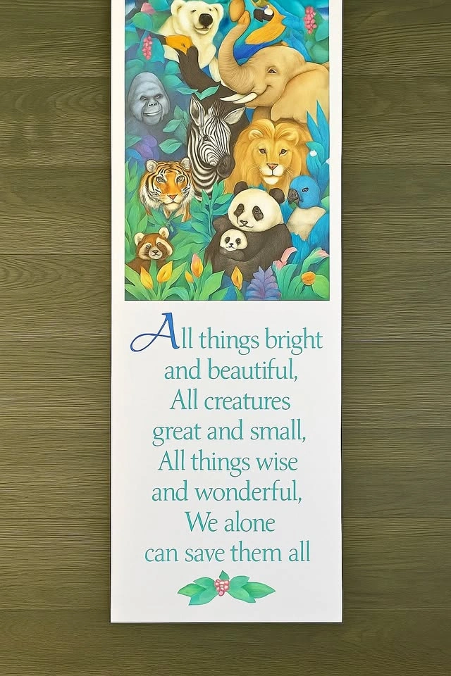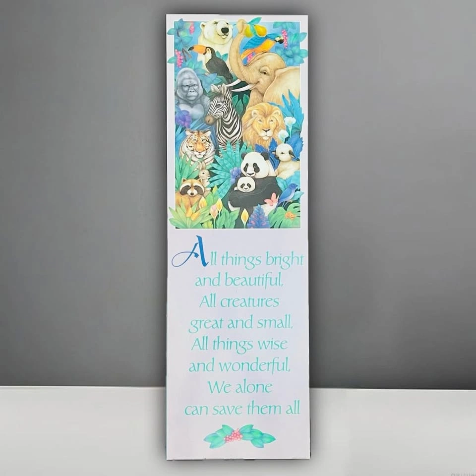 65Bring warmth and colour into your home with this vibrant wall art featuring animals like lions, pandas, elephants, zebras, and tigers, surrounded by greenery. It includes the inspirational message: “All things bright and beautiful, All creatures great and small, All things wise and wonderful, We alone can save them all.” Perfect for a child’s room, nursery, playroom, classroom, or living space. Size: Tall vertical design 92cm x 71cm Condition: Minor chips on the edge but clean, and ready to hang Style: Inspirational / Nature / Animal Theme A meaningful décor piece. Pickup: Oakville, ON
