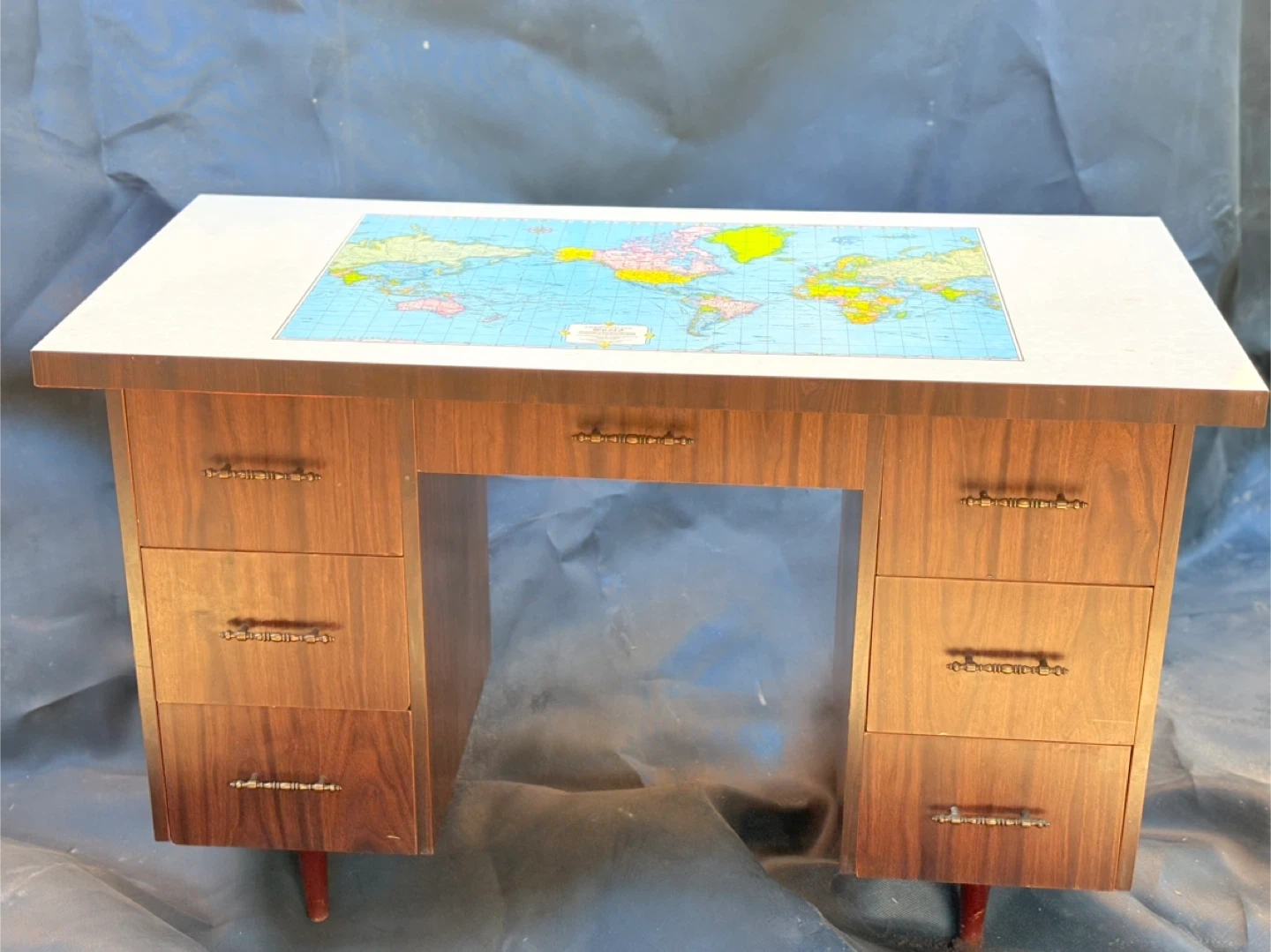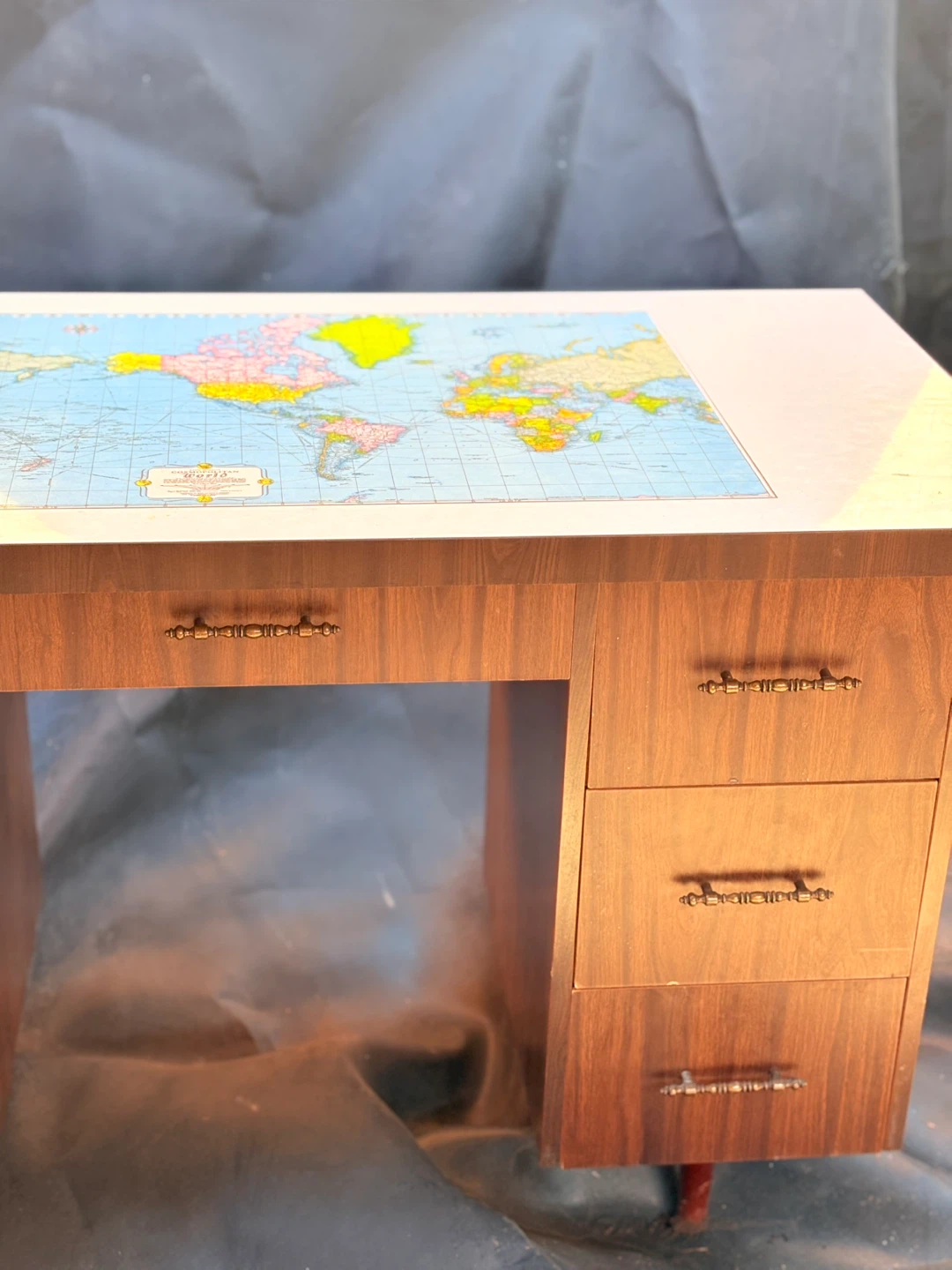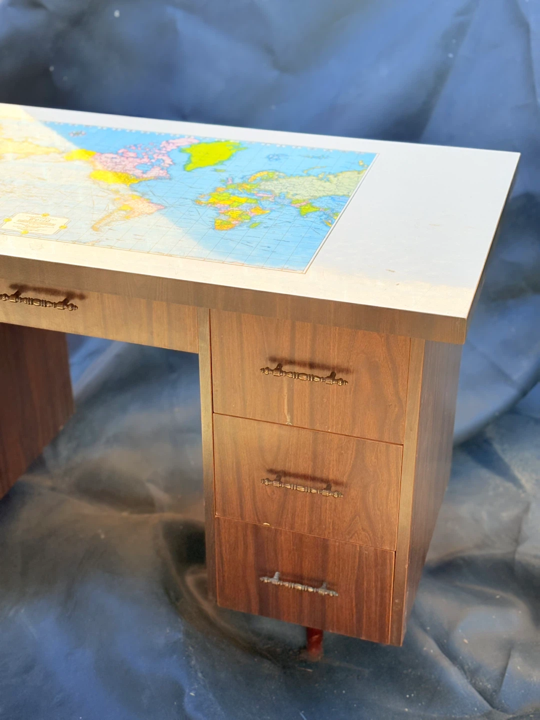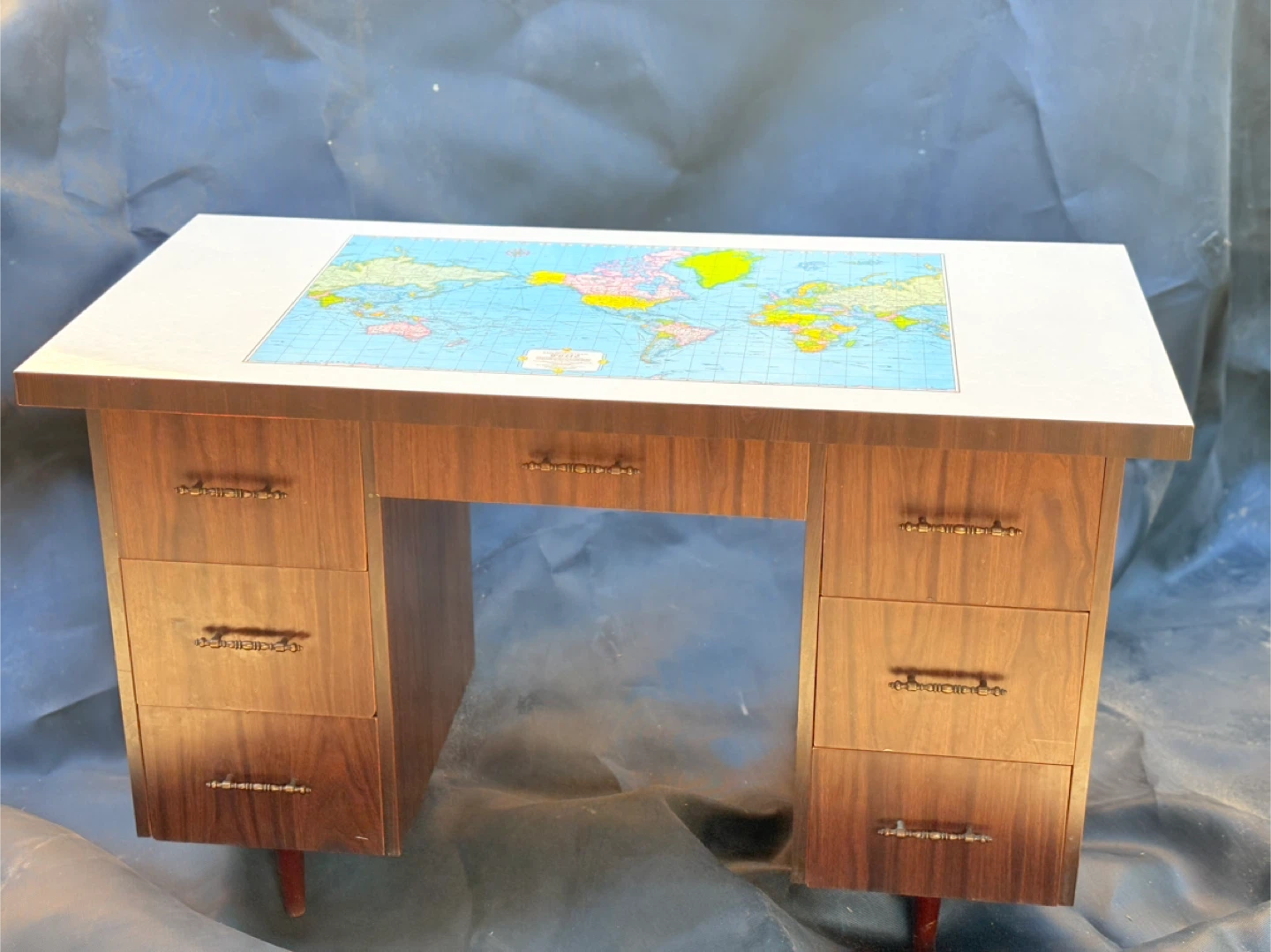 Selling a vintage desk with a world map inlay on top! It features a classic design with multiple drawers for storage. The desk has a unique look that would be great for a home office or study space