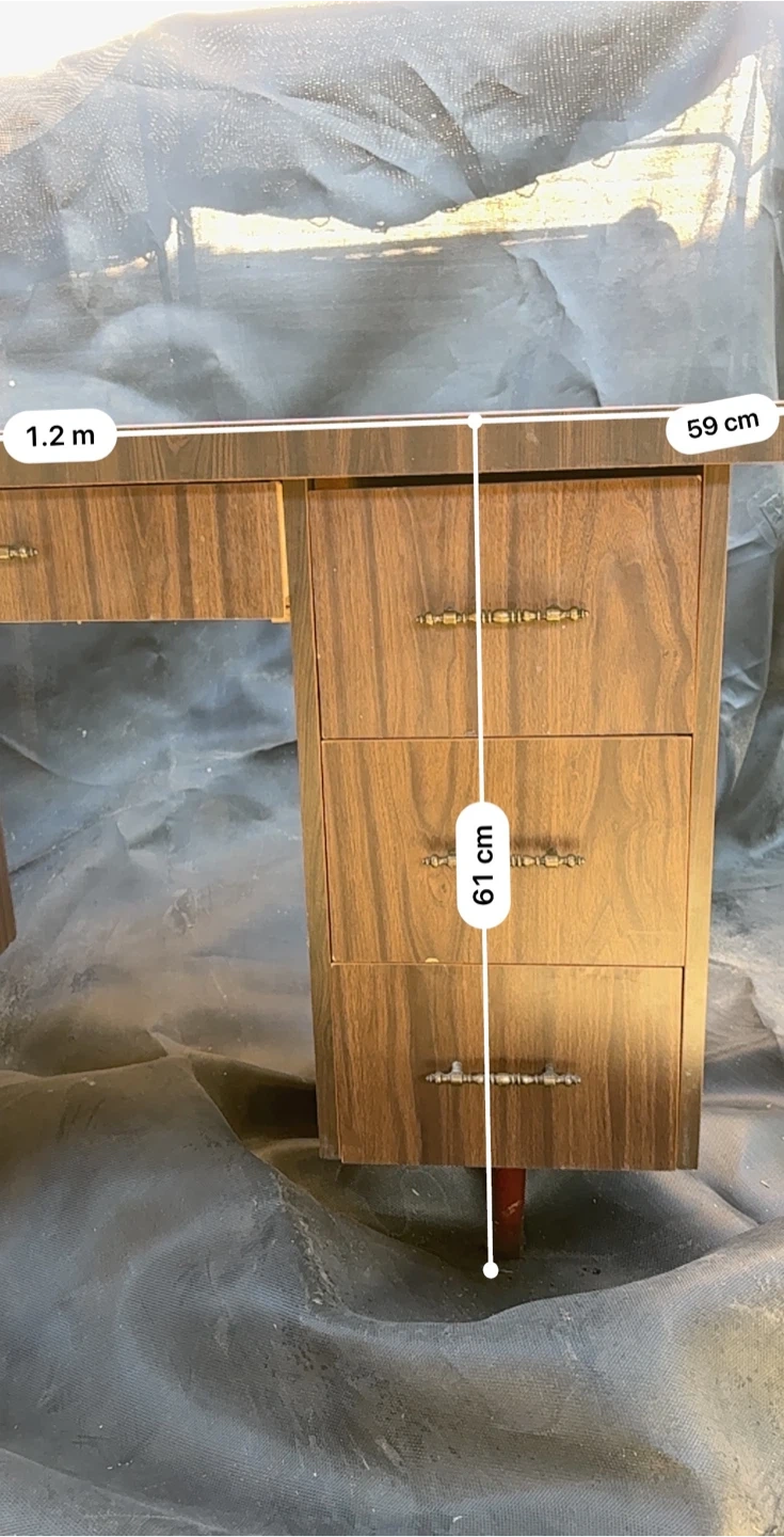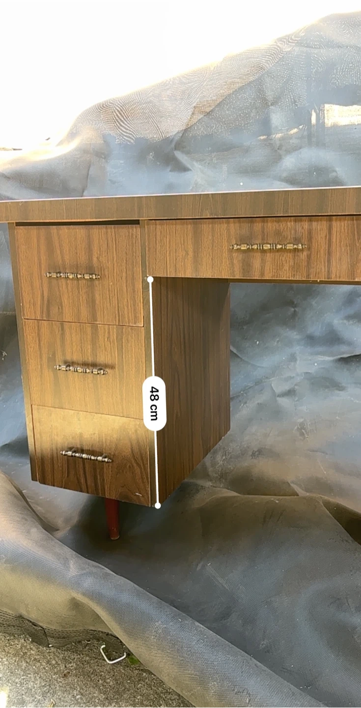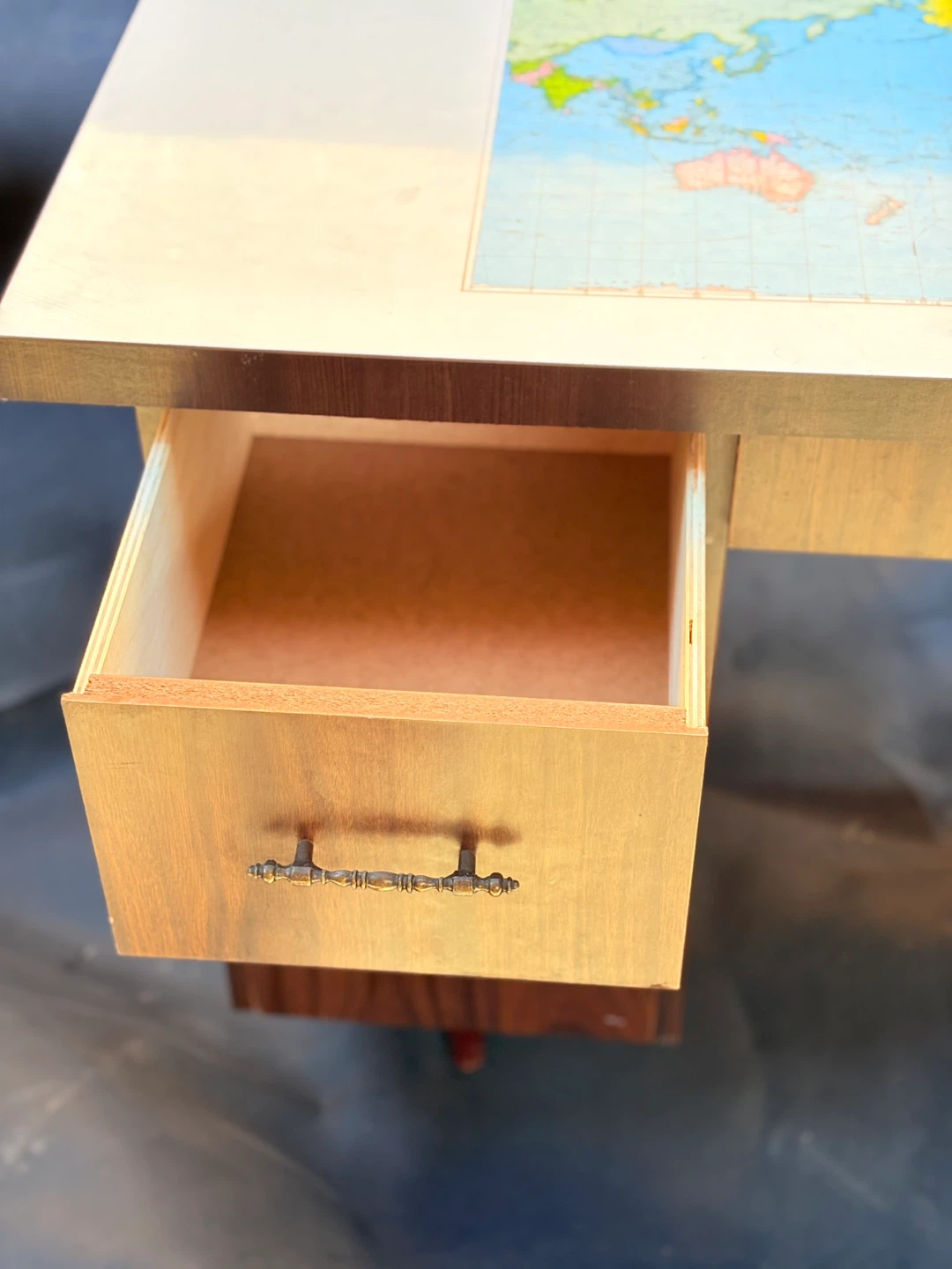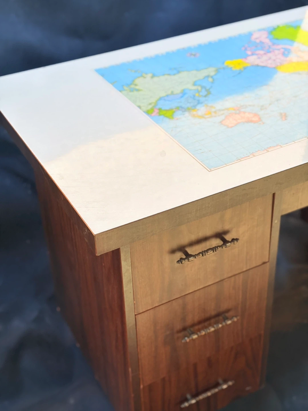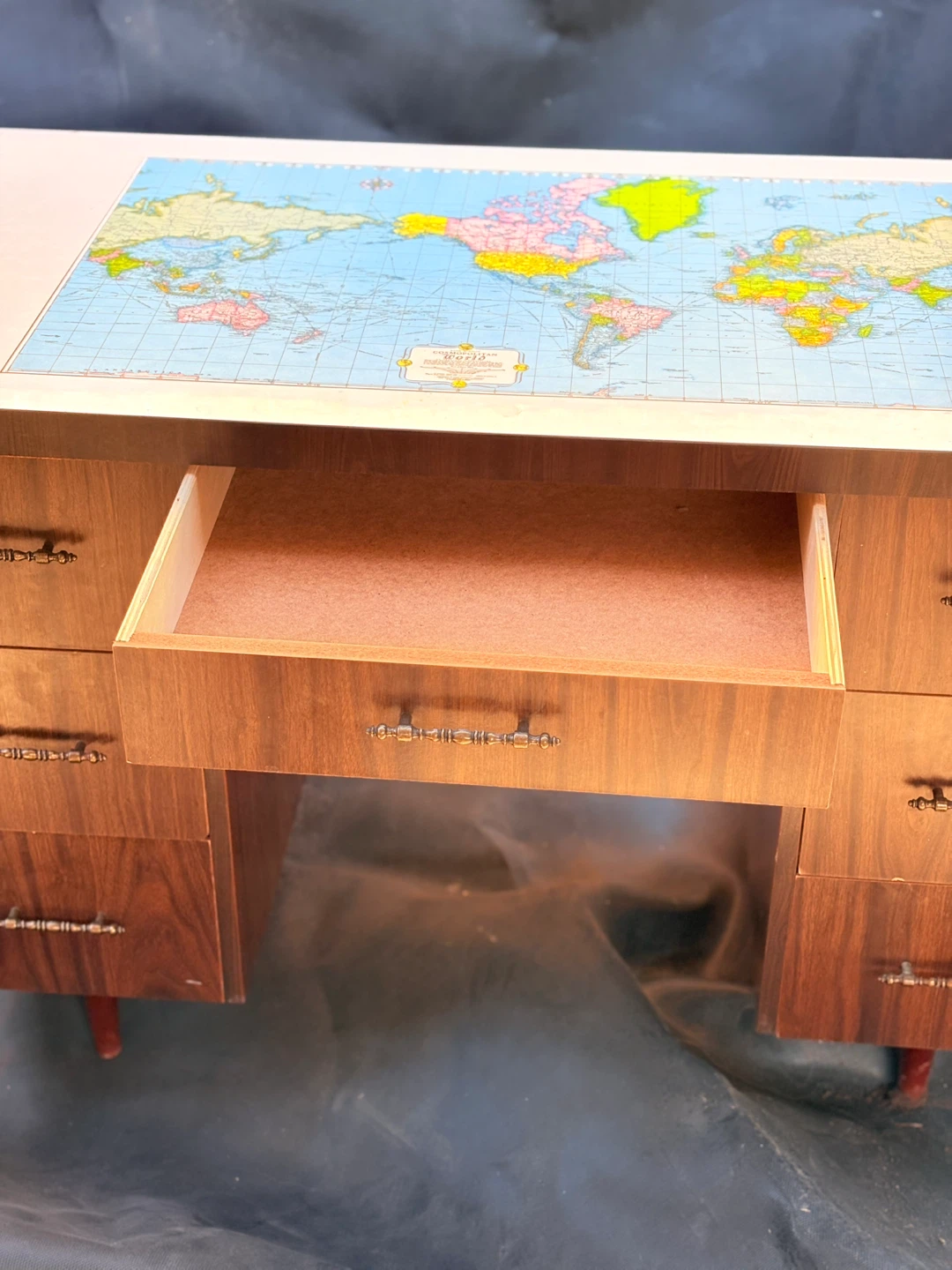 Selling a vintage desk with a world map inlay on top! It features a classic design with multiple drawers for storage. The desk has a unique look that would be great for a home office or study space