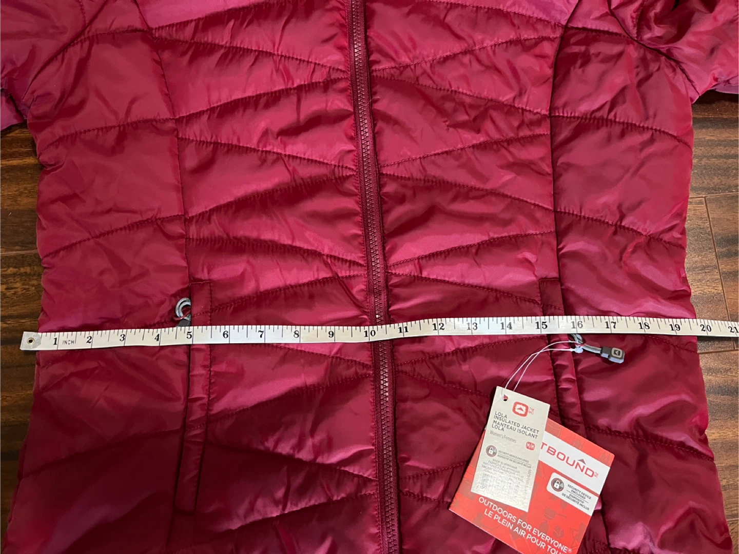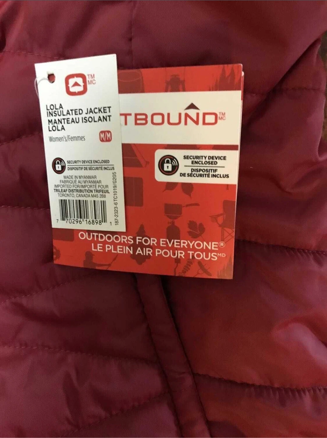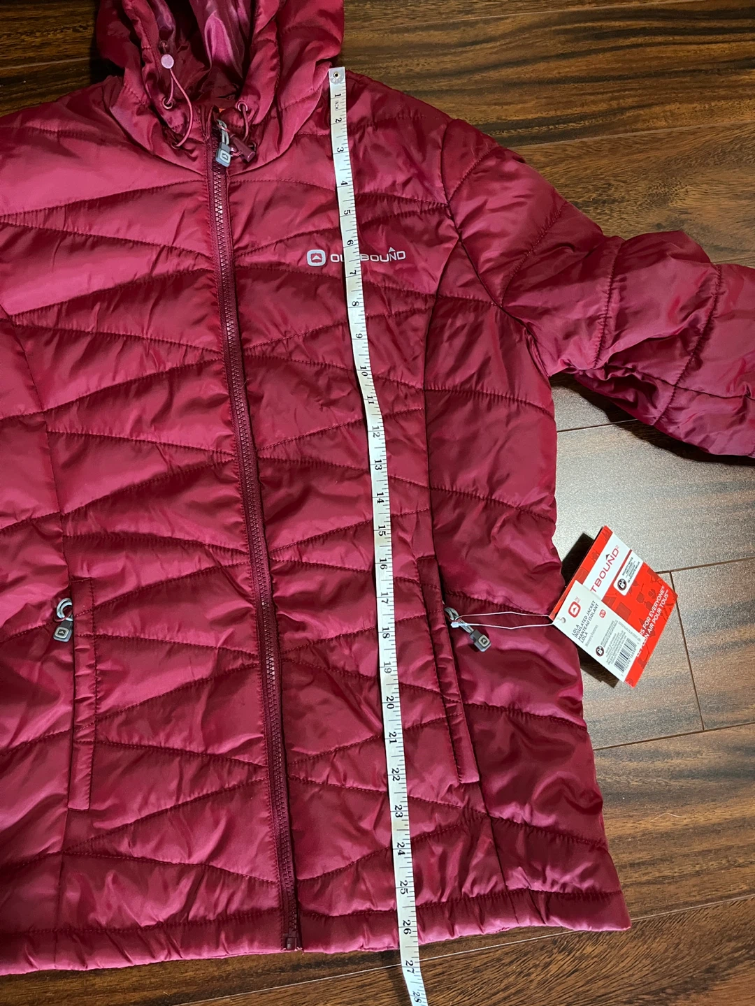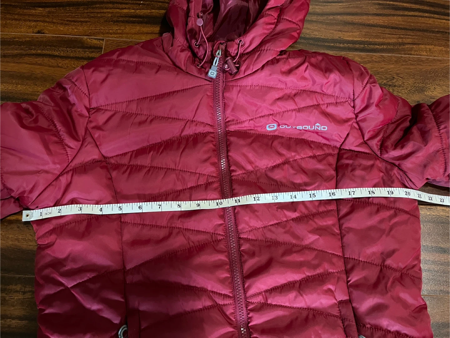 Brand new with tags, this Outbound Lola puffer jacket in cranberry is perfect for the upcoming cold weather. Its breathable, water-resistant fabric and polyfill insulation provide warmth without bulk. Features include a drawstring-adjustable hood, full-zip closure, and zippered pockets for secure storage. Reflective logos enhance visibility during low-light hours. Approximate measurements (laying flat): • Pit to pit: 21” • Length (shoulder to hem): 26.5” • Waist: 20” • Sleeve: 26” (+ 1/4” inner cuff) Pickup in Oshawa - Harmony/Rossland area