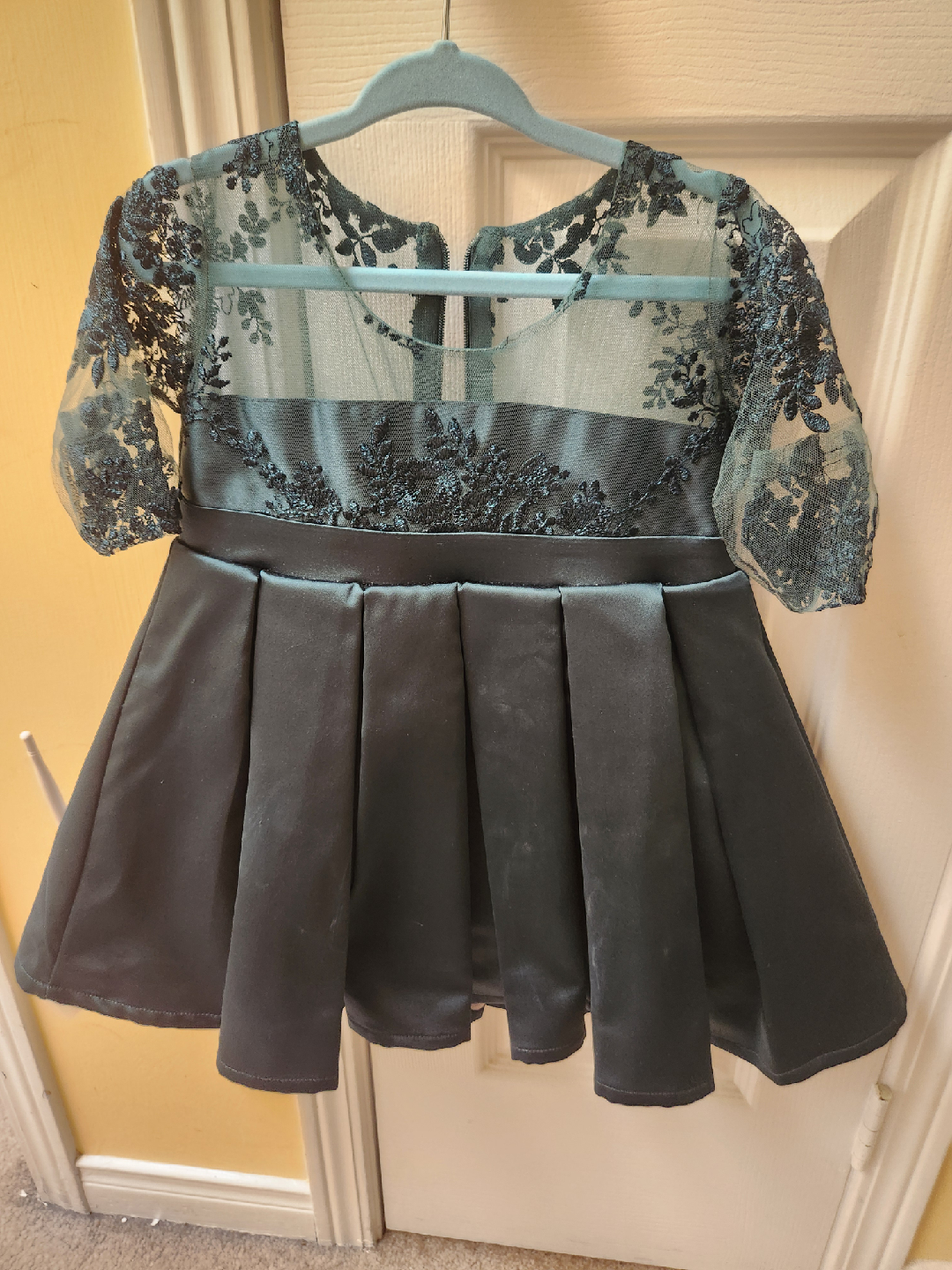 Selling a beautiful emerald green dress. It features lace detailing on the sleeves and bodice, and a large bow at the waist. Perfect for a special occasion! $30 each . More green on personal like the pic ( baby wearing the dress)
