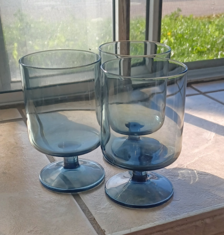 Selling a set of three lovely blue stemmed glasses. They're in great condition and would make a beautiful addition to any table setting! The glasses have a nice, sturdy base and a unique design that is sure to impress your guests.