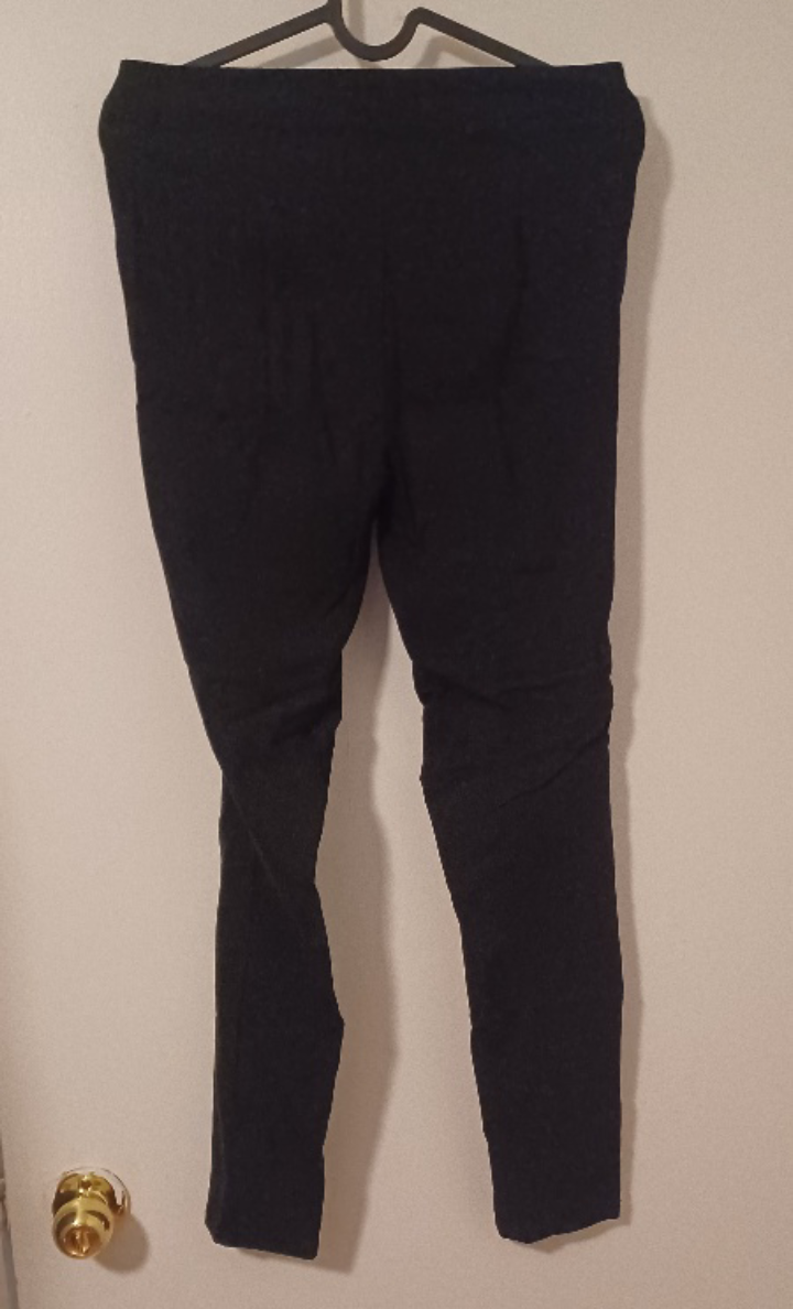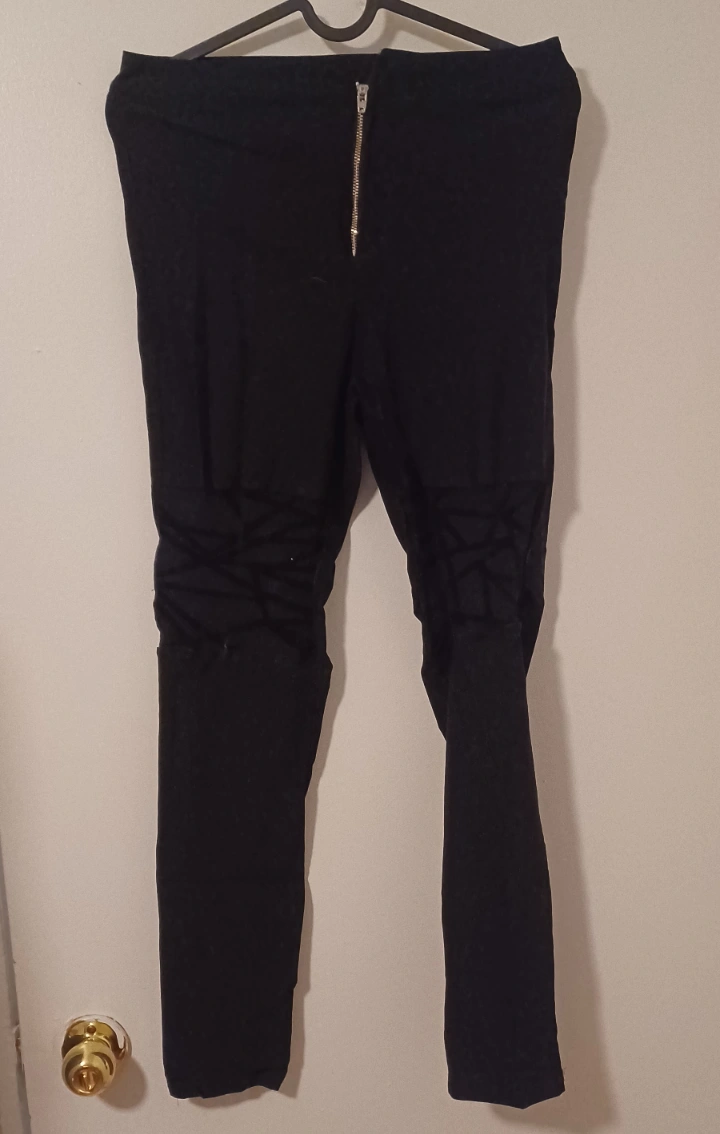 Selling a pair of black pants with a zipper front. They have a unique design with a sheer, criss-cross pattern on the knee. They're in good condition and ready for a new home! Radcycled!